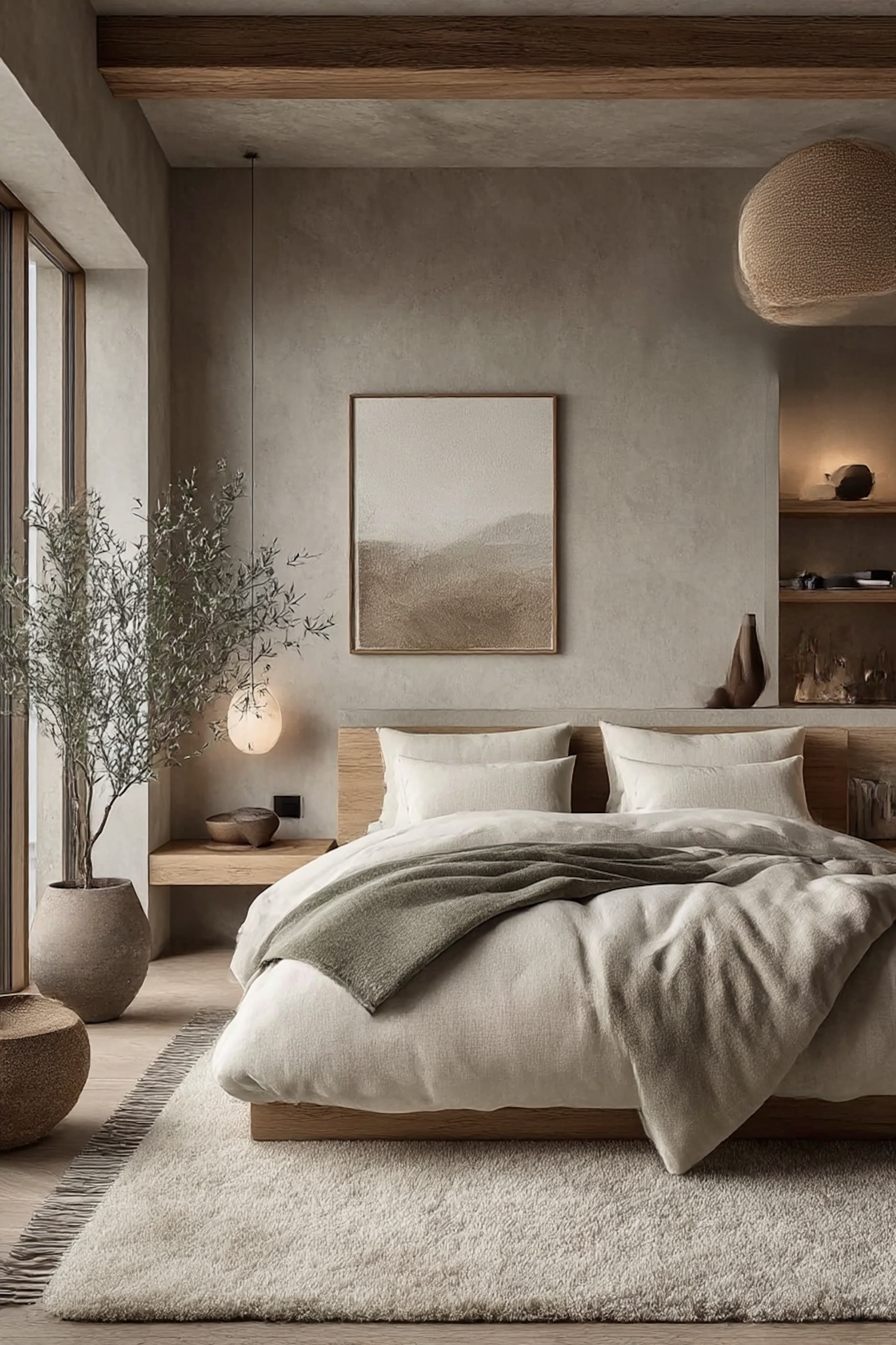 Minimalist bedroom with neutral tones, a cozy bed, potted plant, and natural light creating a serene and inviting atmosphere.