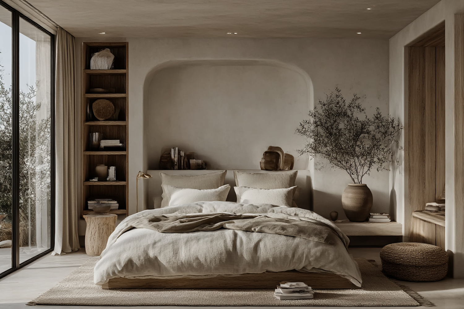Minimalist bedroom with beige tones, soft linens, wooden accents, and natural light from a large window, creating a serene atmosphere.