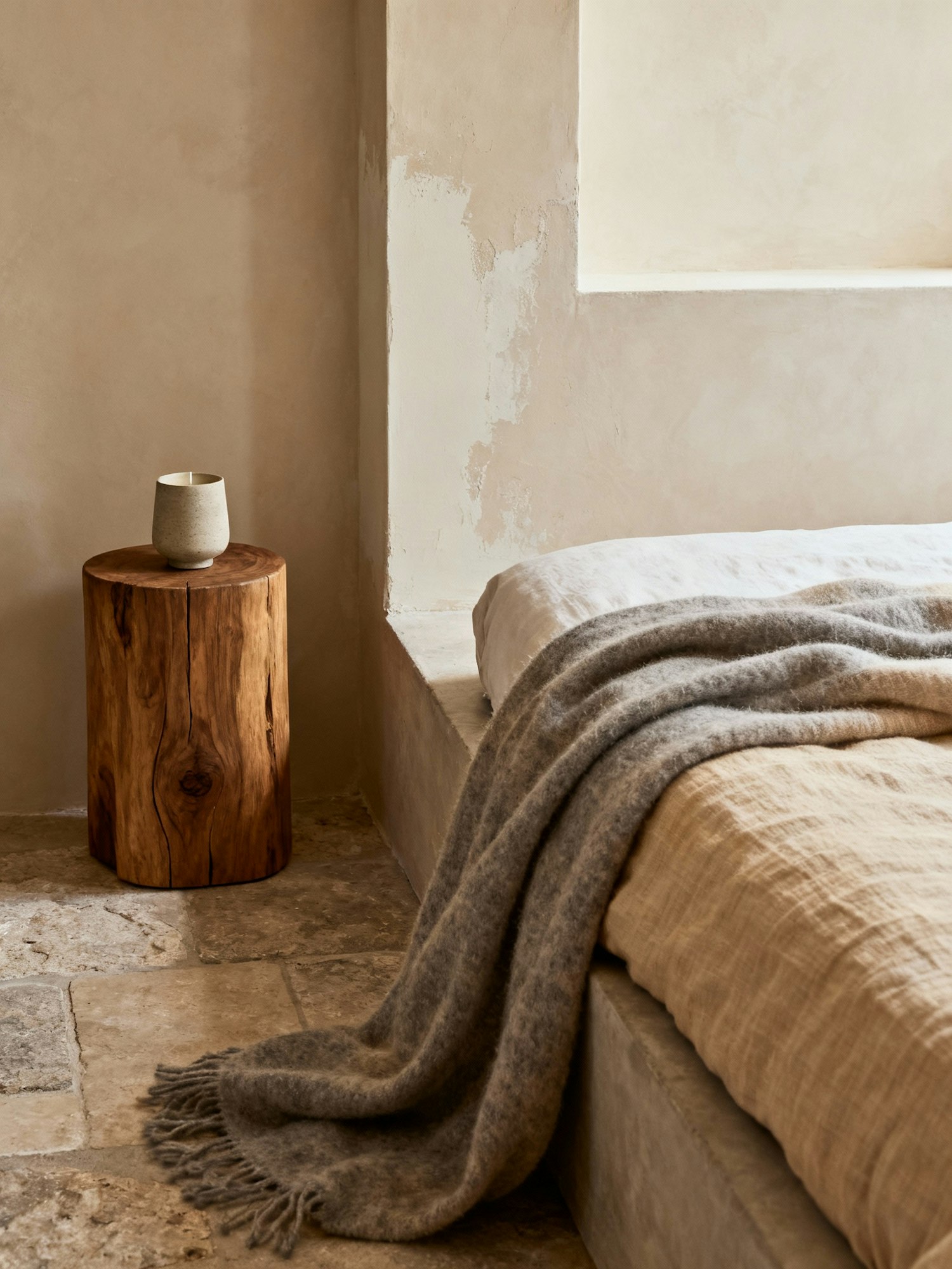 Nordic interior photography, shot in natural daylight — serene and contemplative atmosphere. Soft diffused light from side windows, gentle shadows, warm neutral palette with tones of beige, tan, and muted brown. Use raw and tactile materials like oak wood, linen, stone, brushed metal. Minimal composition with air and negative space. Realistic photo with subtle grain, no overexposure. Architectural framing, calm and timeless design aesthetic inspired by FRAMA — quiet luxury, Scandinavian minimalism, sensory stillness. A close-up view of a bed corner showing the linen texture in detail. A wool throw in muted grey-beige tones rests over the edge, and a ceramic candle holder sits on the nearby wooden stool. The wall behind shows limewash depth and imperfections. The overall light is soft, creating a contemplative, lived-in feeling of comfort and authenticity.