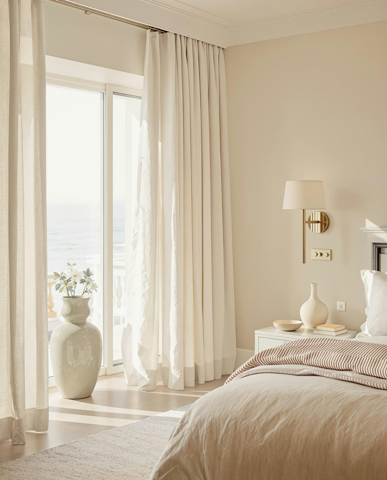 Bright, minimalist bedroom with neutral tones, sheer curtains, and elegant decor. Features a cozy bed, ceramic vases, and natural light.