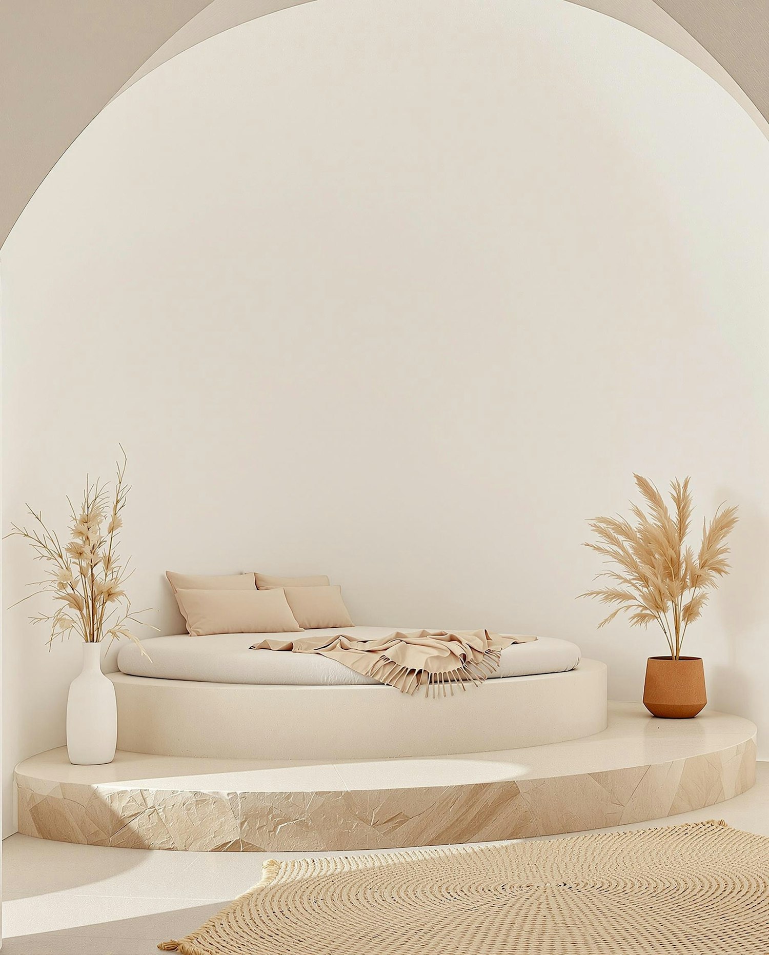 Minimalist bedroom with a round bed, neutral tones, pampas grass decor, and a textured platform for a serene, modern aesthetic.