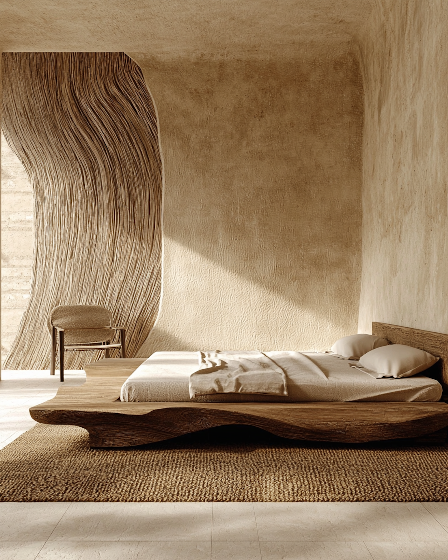 Minimalist bedroom with a sculptural wooden bed, textured walls, and earthy tones. Natural light highlights the serene, organic design.