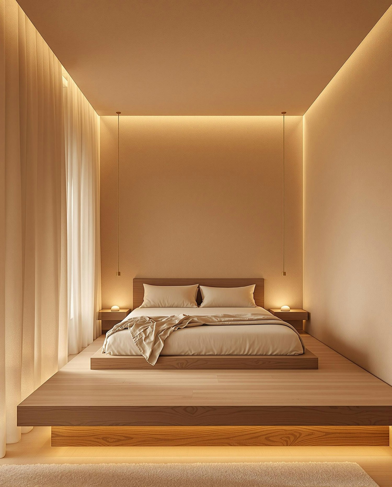 Minimalist bedroom with a wooden platform bed, warm lighting, and beige tones. Floating nightstands and sheer curtains complete the cozy look.