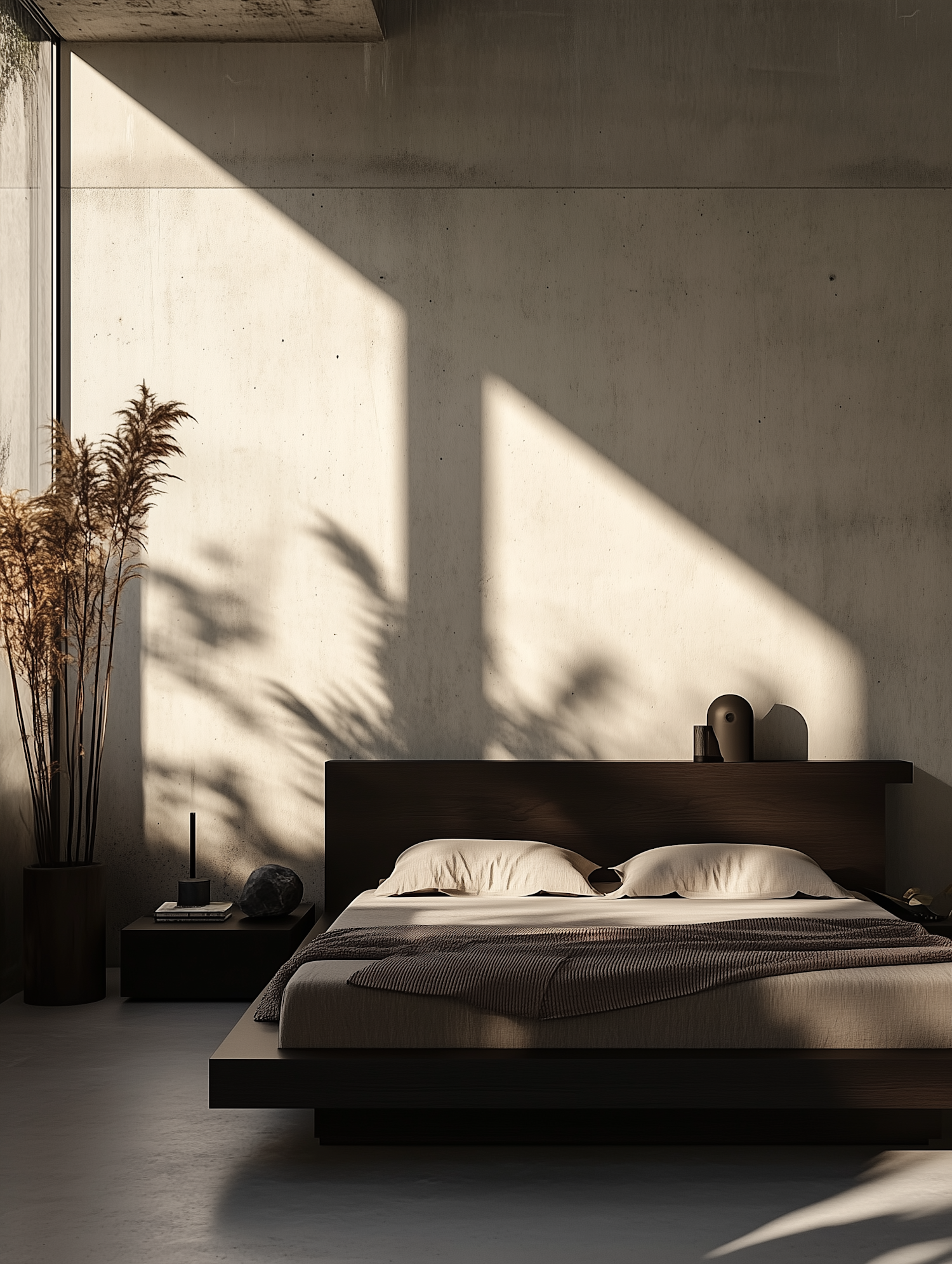 Minimalist bedroom with a dark wooden bed, beige bedding, pampas grass, and natural light casting shadows on concrete walls.