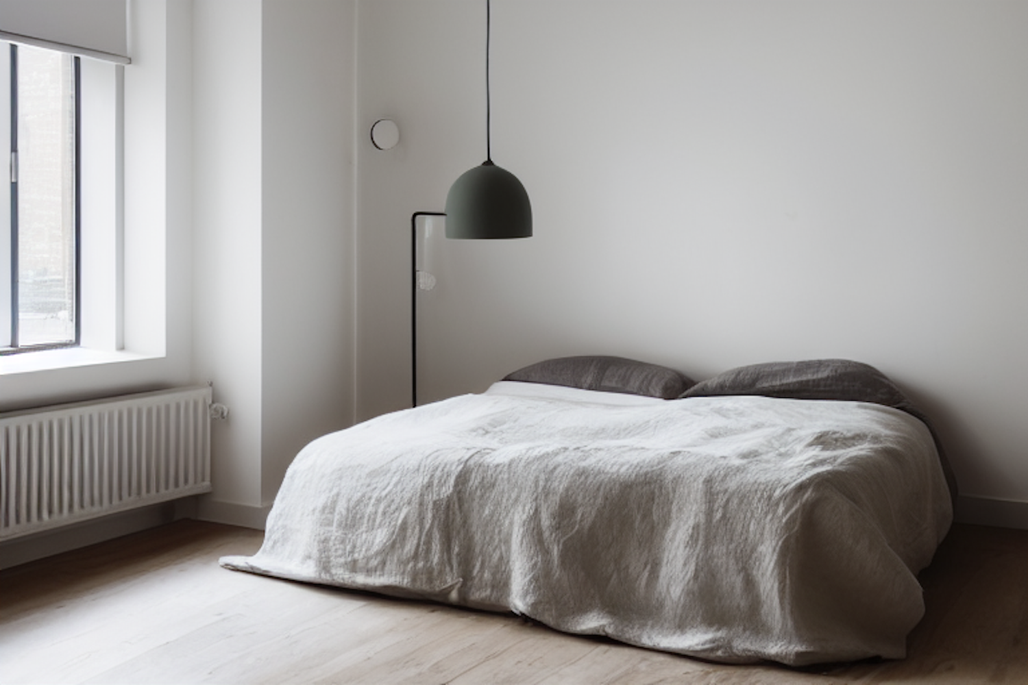 Minimalist bedroom with a large bed, white linen duvet, dark gray pillows, and a green pendant lamp. Soft white walls and light wooden floor.