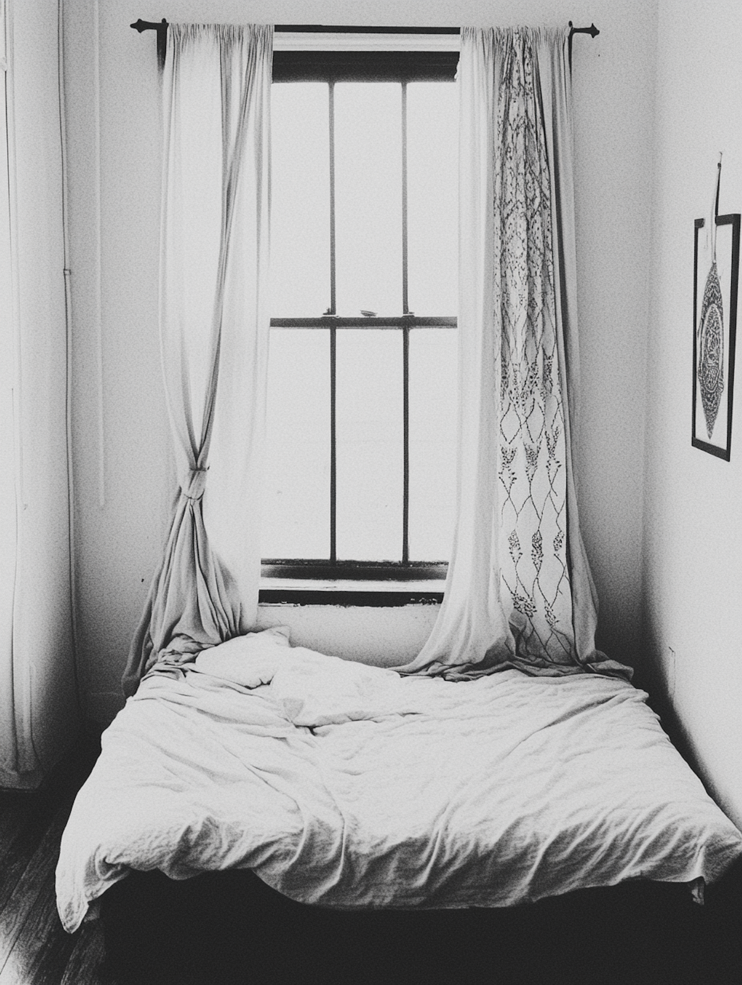 Minimalist black-and-white bedroom with a crumpled bed, patterned curtains, and a large window. Simple, serene, and understated design.