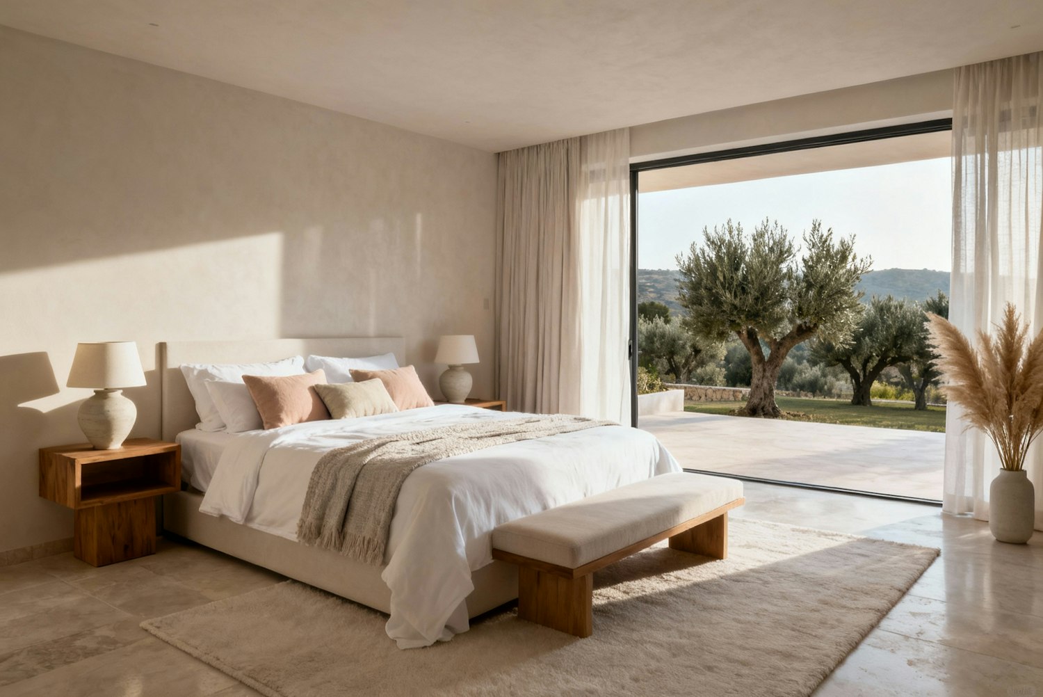 A cozy, minimalist bedroom with natural light, soft tones, and a view of olive trees through a large glass door.