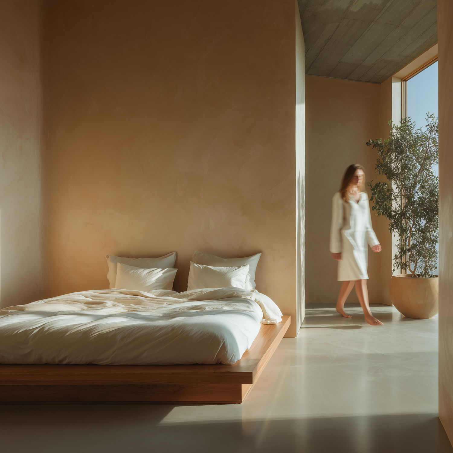 Minimalist bedroom with a wooden platform bed, white bedding, and natural light. A woman in a white dress walks near a potted plant by the window.