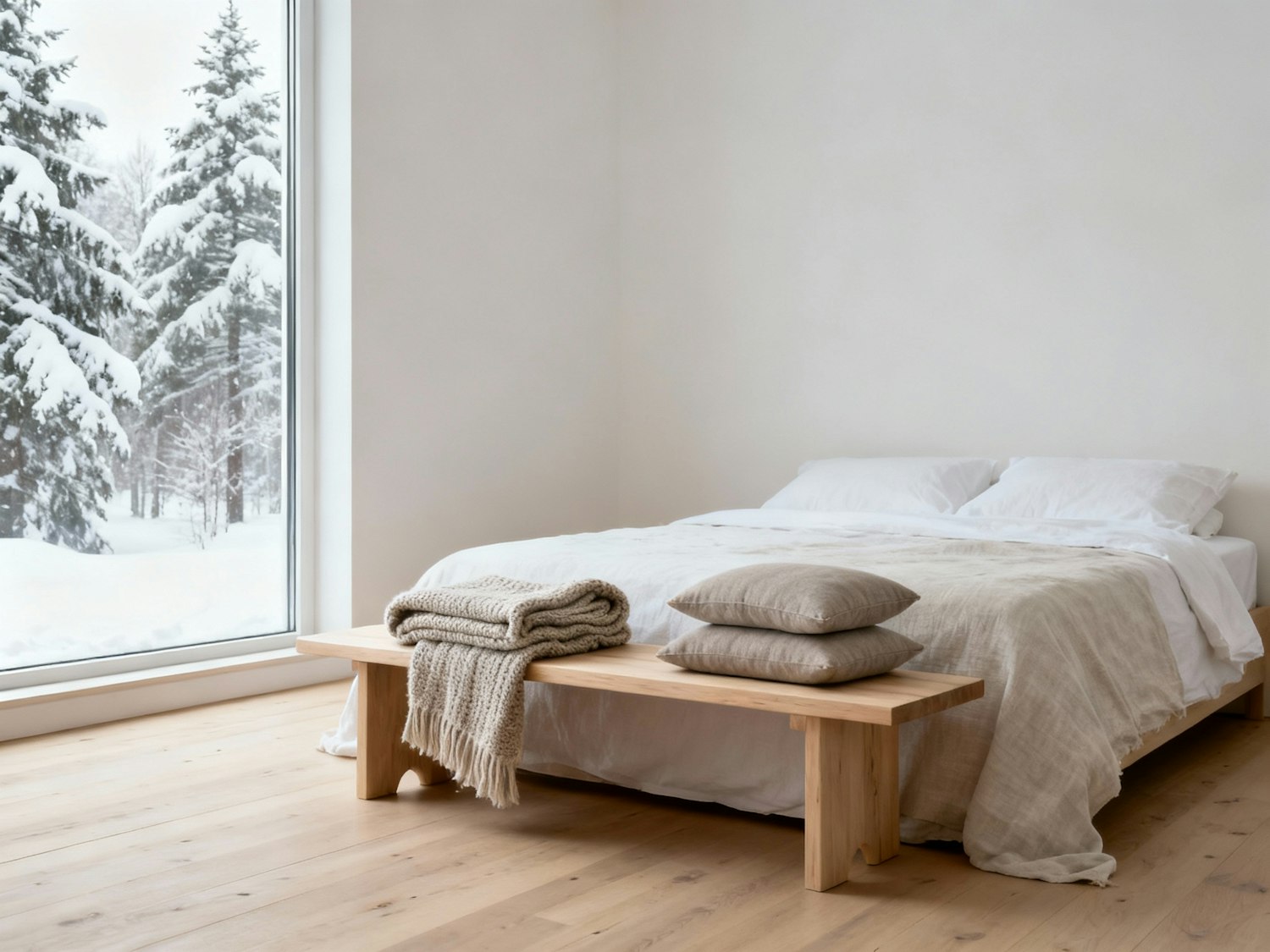 Winter bedroom with large window on camera-left showing snowy trees; at the foot of the bed a light wood bench, on it a folded knit throw and two stacked neutral pillows, bed itself in plain white/linen bedding; floor light wood, wall off-white, daylight soft and even. 35 mm, f/4, ISO 100, 1/160 s. Negative: Christmas bedding, bold patterns, cluttered nightstands.