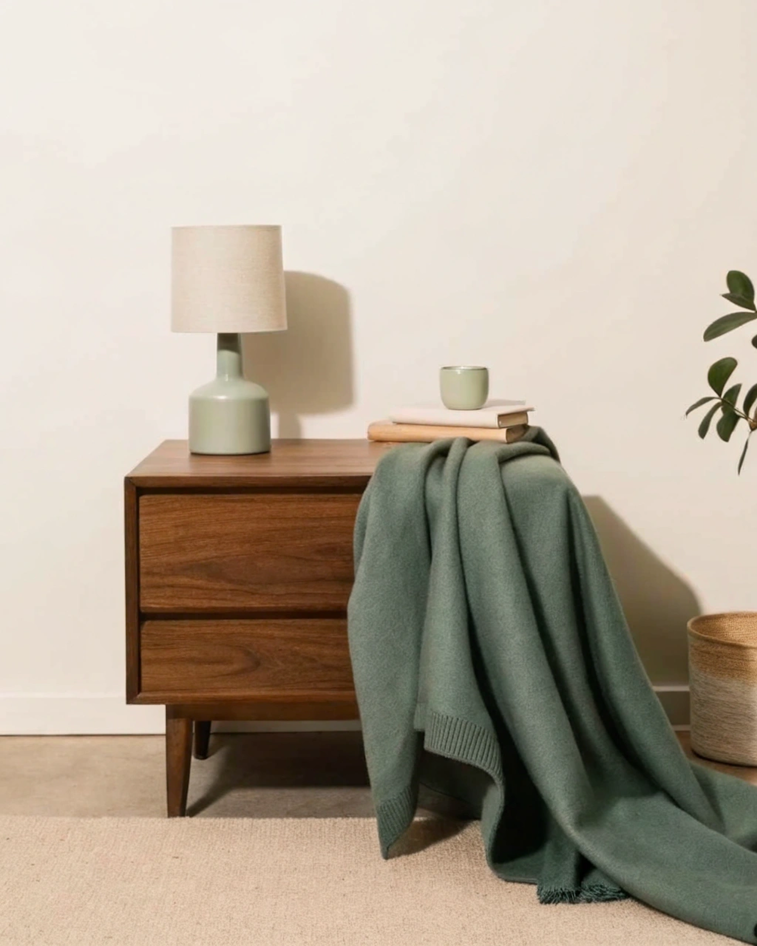 Minimalist wooden nightstand with a ceramic lamp, sage green blanket, books, and a potted plant for a cozy, modern bedroom vibe.