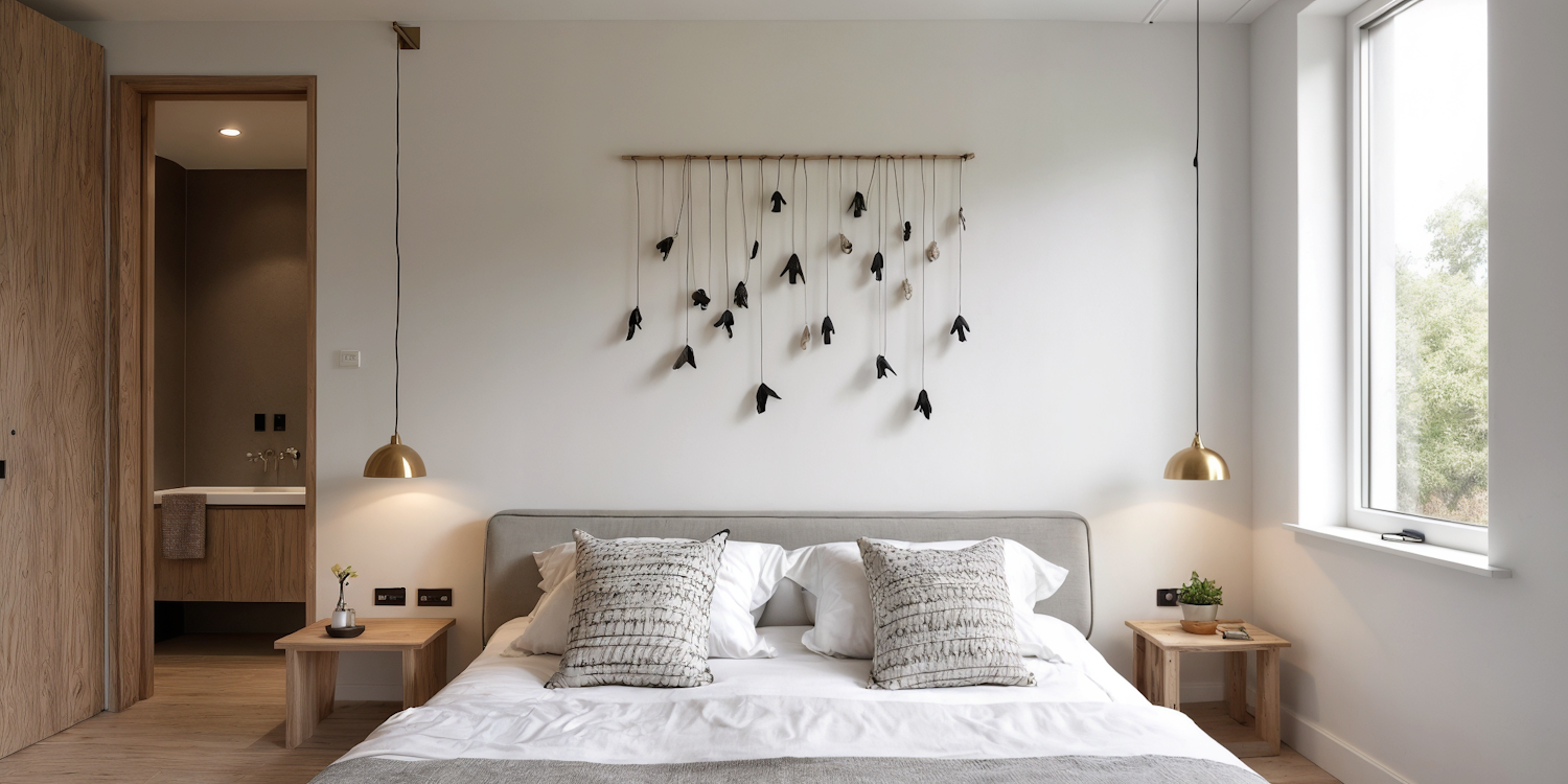 A serene modern bedroom with minimalist decor, featuring a cozy bed, golden lamps, and a decorative wall hanging.