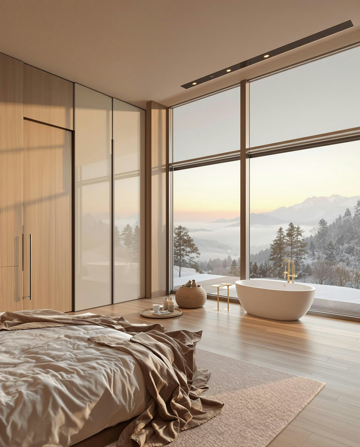 Minimalist bedroom with a cozy bed, freestanding tub, and stunning mountain views through floor-to-ceiling windows at sunrise.