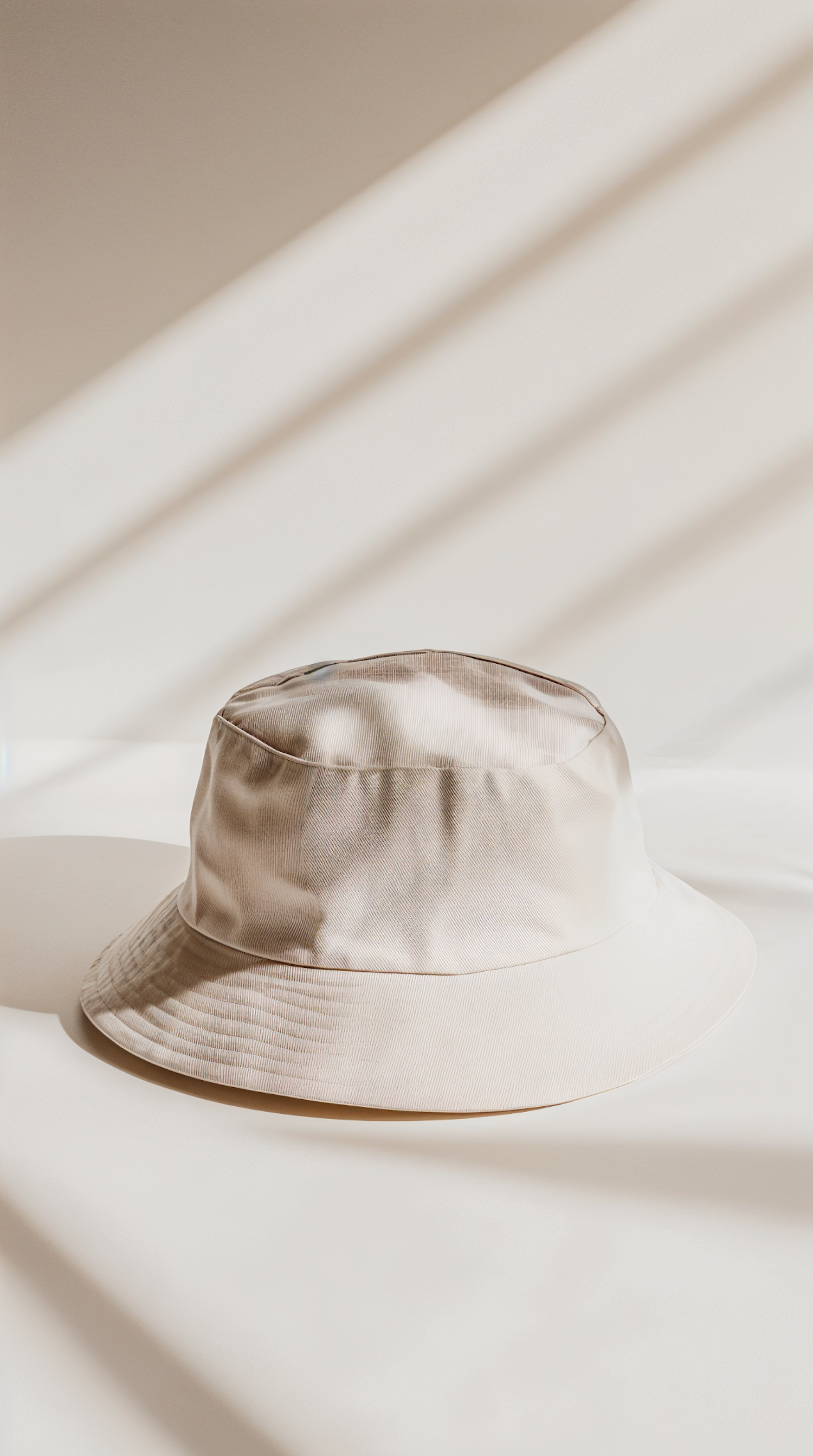 Minimalist beige bucket hat on a light surface with soft shadows from blinds, creating a serene and stylish composition.