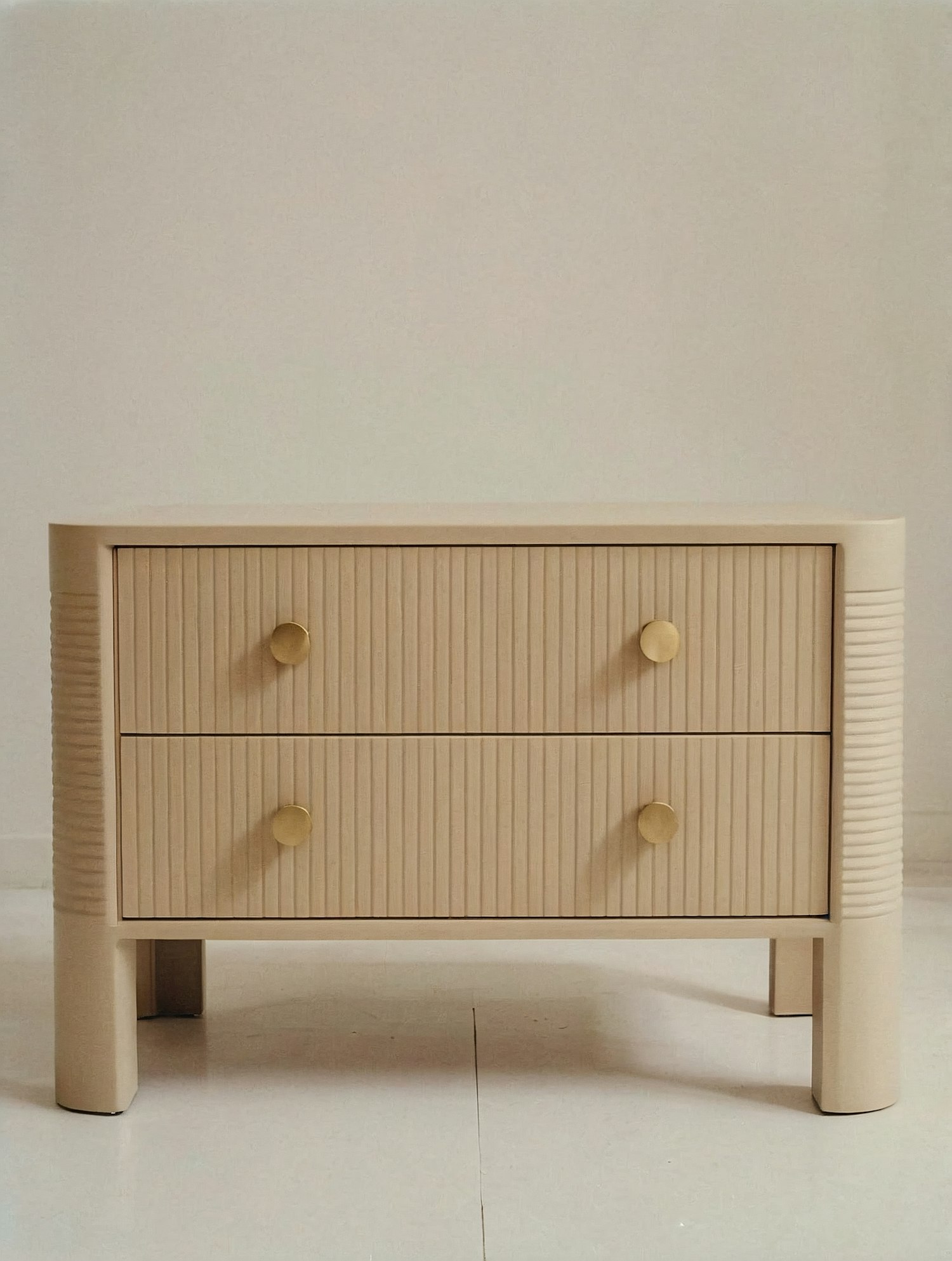 Minimalist beige chest of drawers with ribbed texture, gold knobs, and cylindrical legs, perfect for modern interiors.
