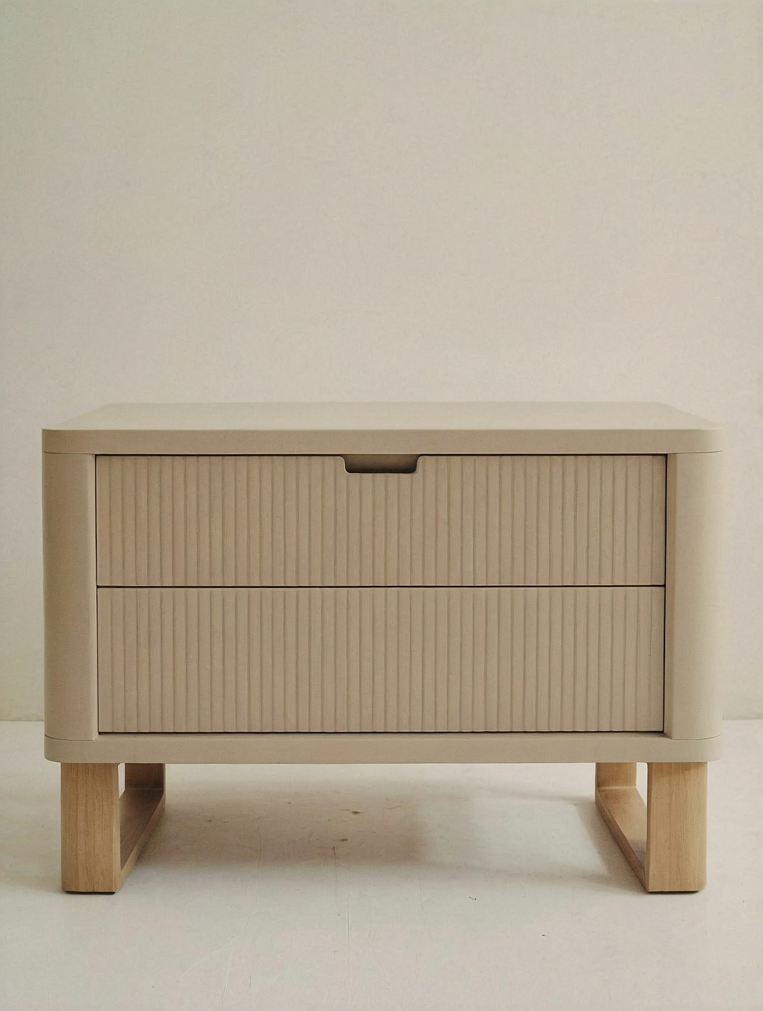 Minimalist beige nightstand with grooved drawers and wooden legs, perfect for modern or Scandinavian-style interiors.