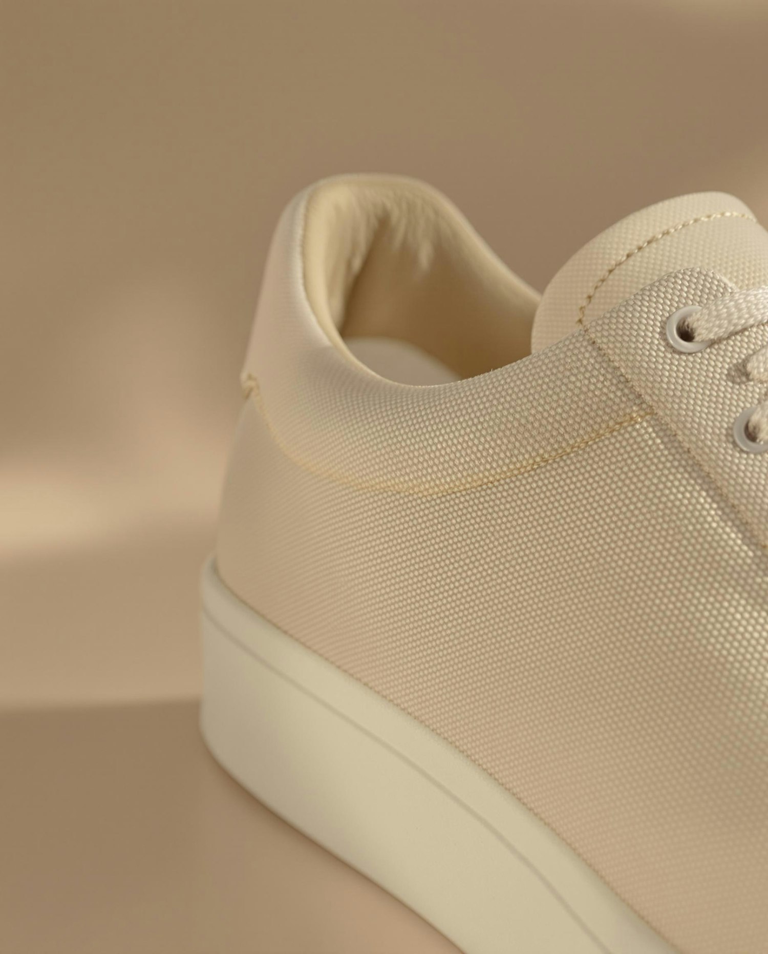 Minimalist beige sneaker with textured fabric, clean stitching, and a smooth white sole. Perfect for casual and stylish looks.