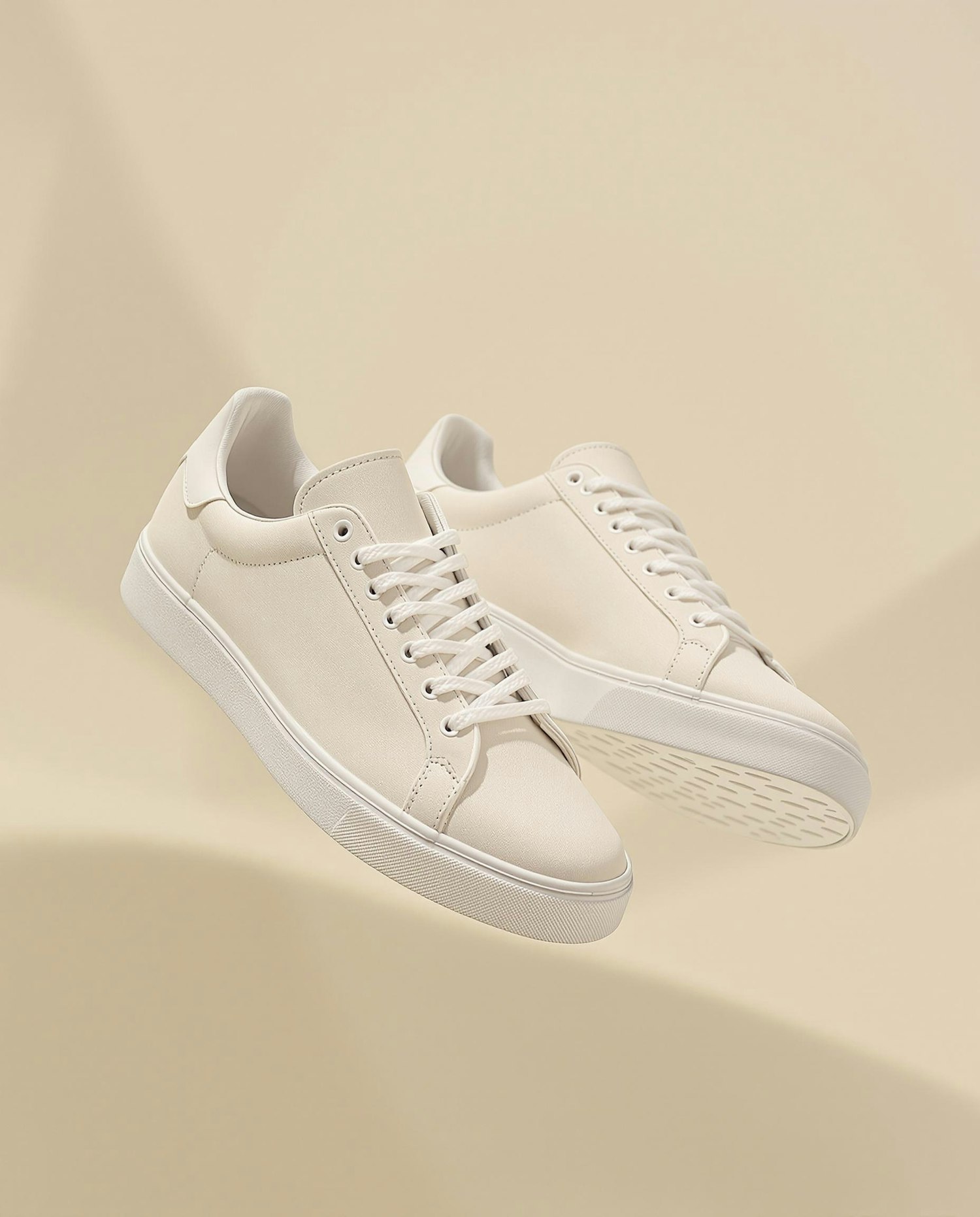 Minimalist beige sneakers with white soles and laces, floating against a matching beige background. Perfect for a clean, modern look.