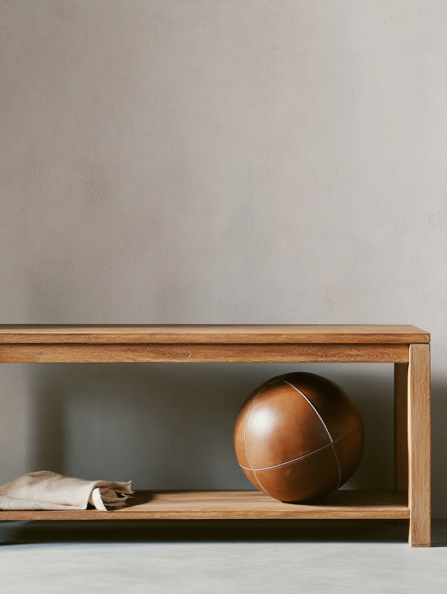 Minimalist wooden bench with a leather medicine ball and folded fabric on a beige wall background. Perfect for modern, natural decor inspiration.
