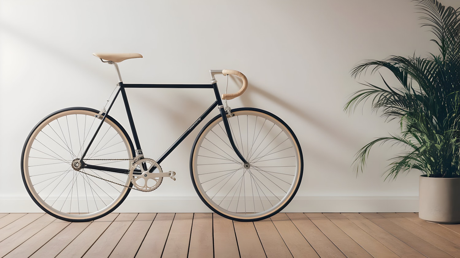 Minimalist black fixed-gear bike with tan accents against a white wall, wooden floor, and a green potted plant for a modern aesthetic.