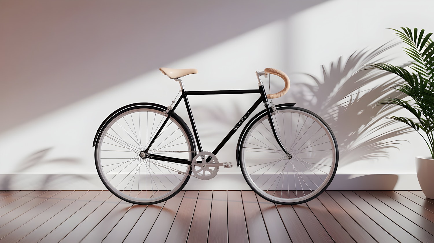 Minimalist black bicycle with cream accents against a white wall, sunlight and plant shadows creating a serene, modern vibe.
