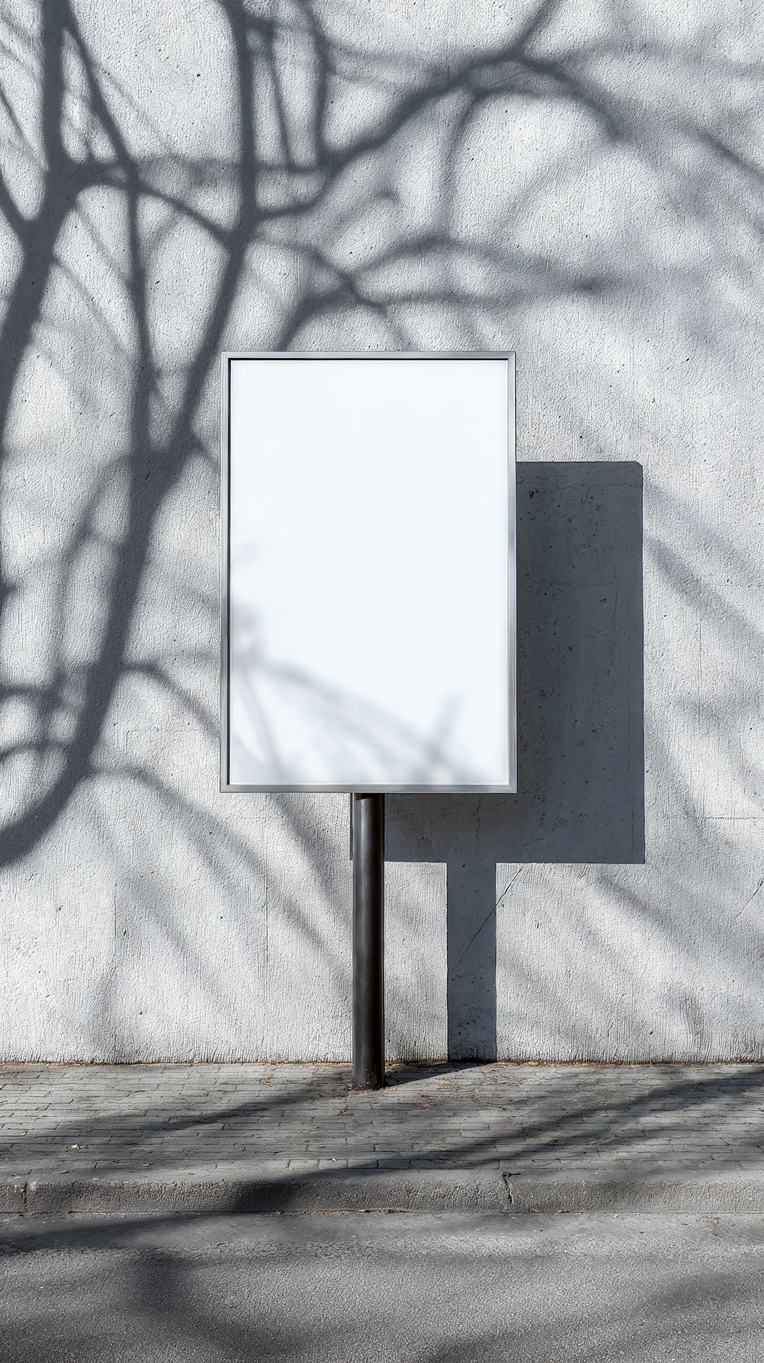 Minimalist blank billboard on a black pole, set against a gray concrete wall with tree branch shadows. Perfect for mockups or design projects.
