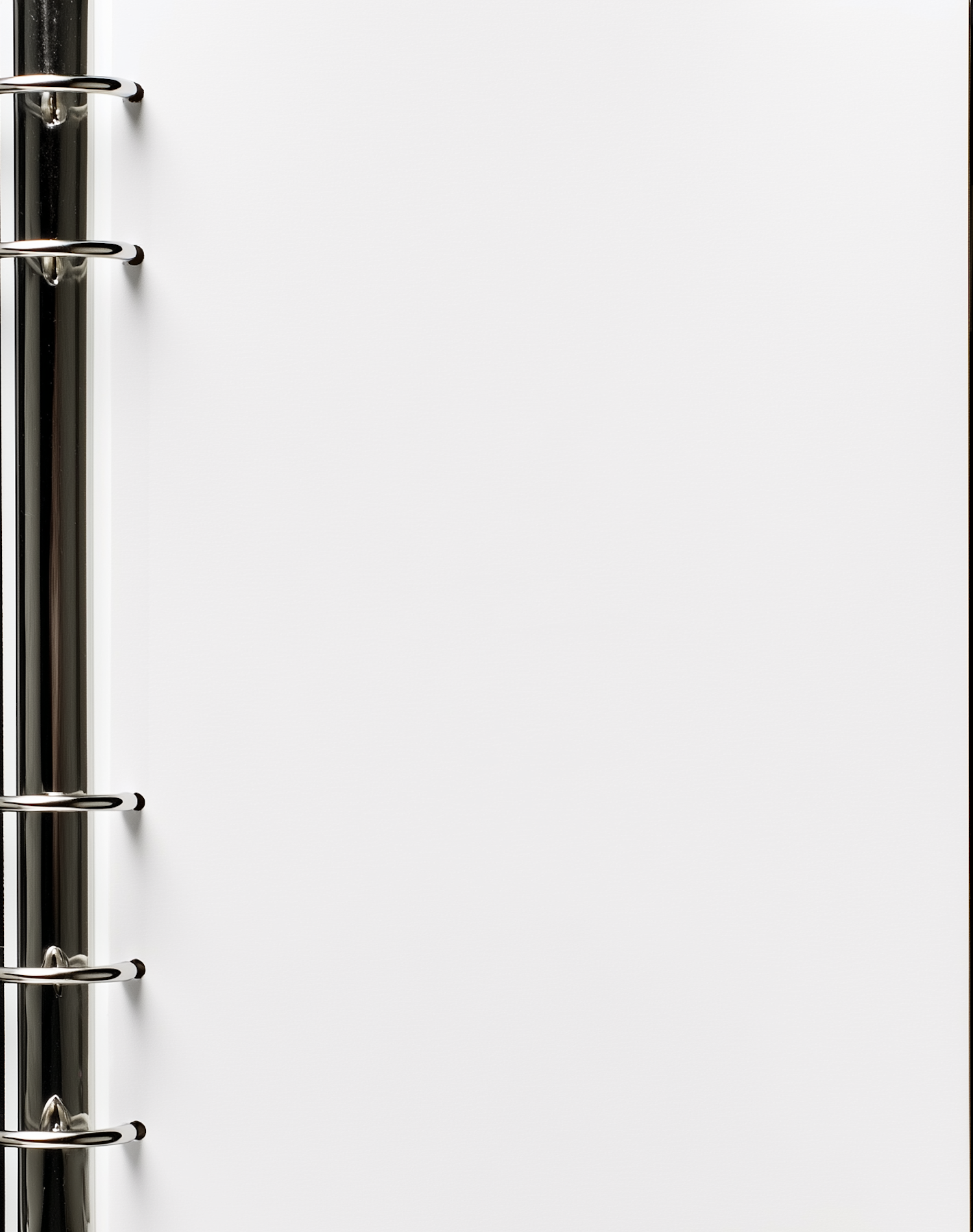 Close-up of a white binder with shiny metal rings and a blank page, perfect for office or school organization themes.