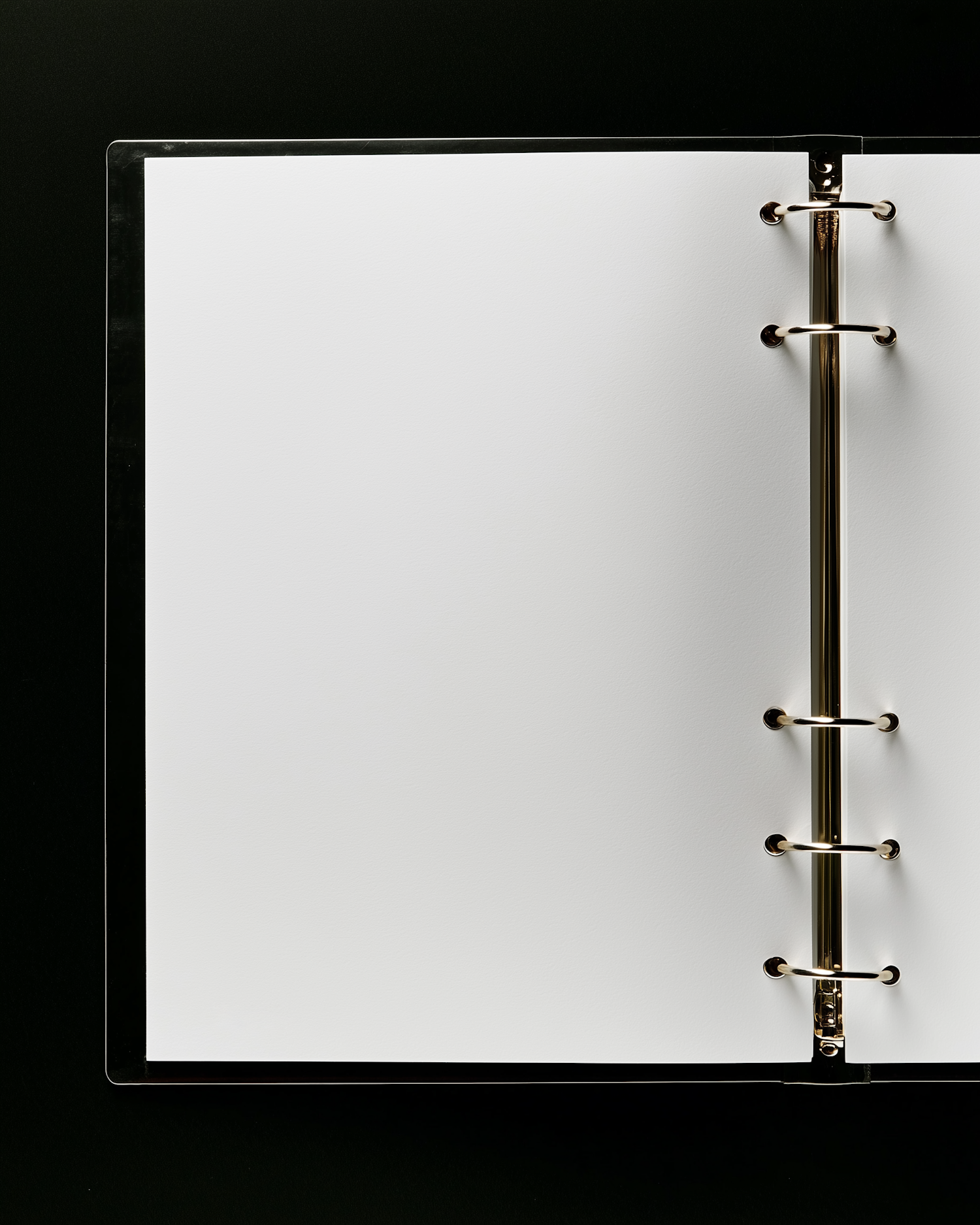 Open binder with blank white pages and shiny metallic rings against a black background, perfect for office or school themes.