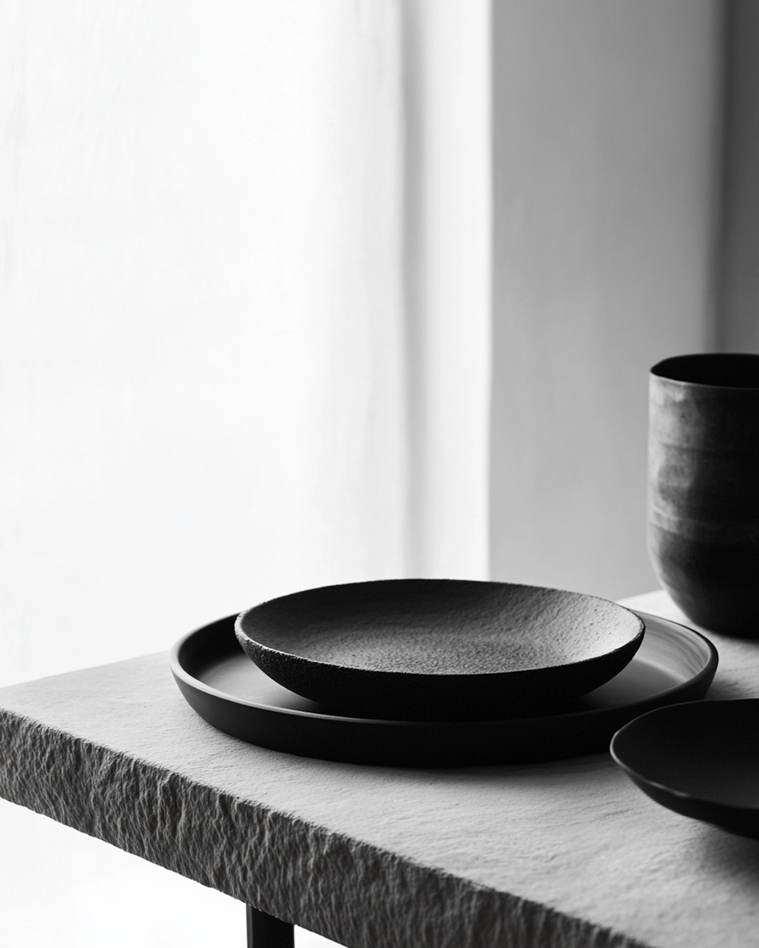 Minimalist black ceramic dishes on a textured stone table, with soft lighting and a monochromatic palette for a serene aesthetic.
