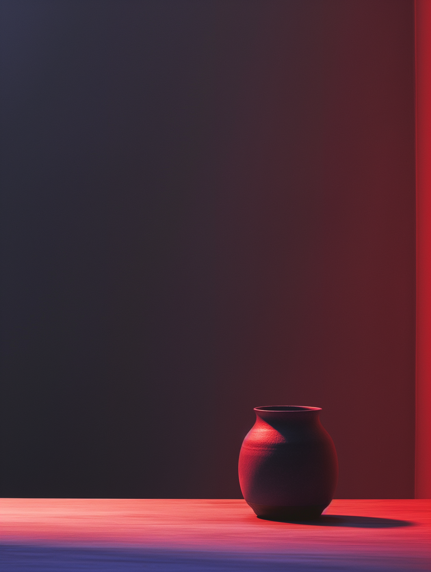 A dark clay pot on a wooden surface with dramatic red and blue lighting, creating a vivid contrast against a dark background.