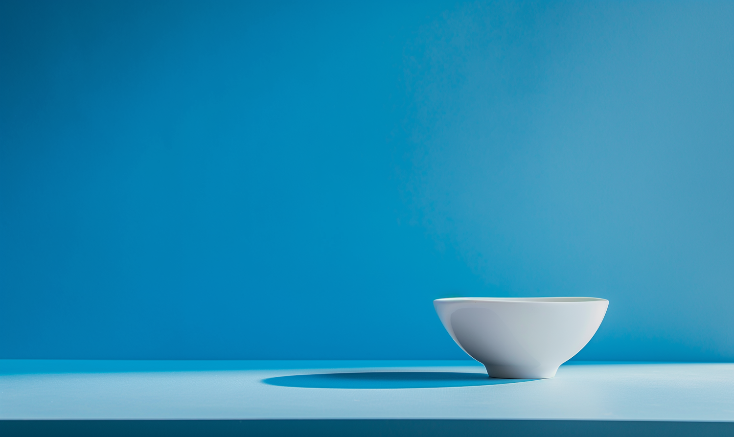 Minimalist white bowl on a light blue surface with a vibrant blue background, creating a modern and striking contrast.