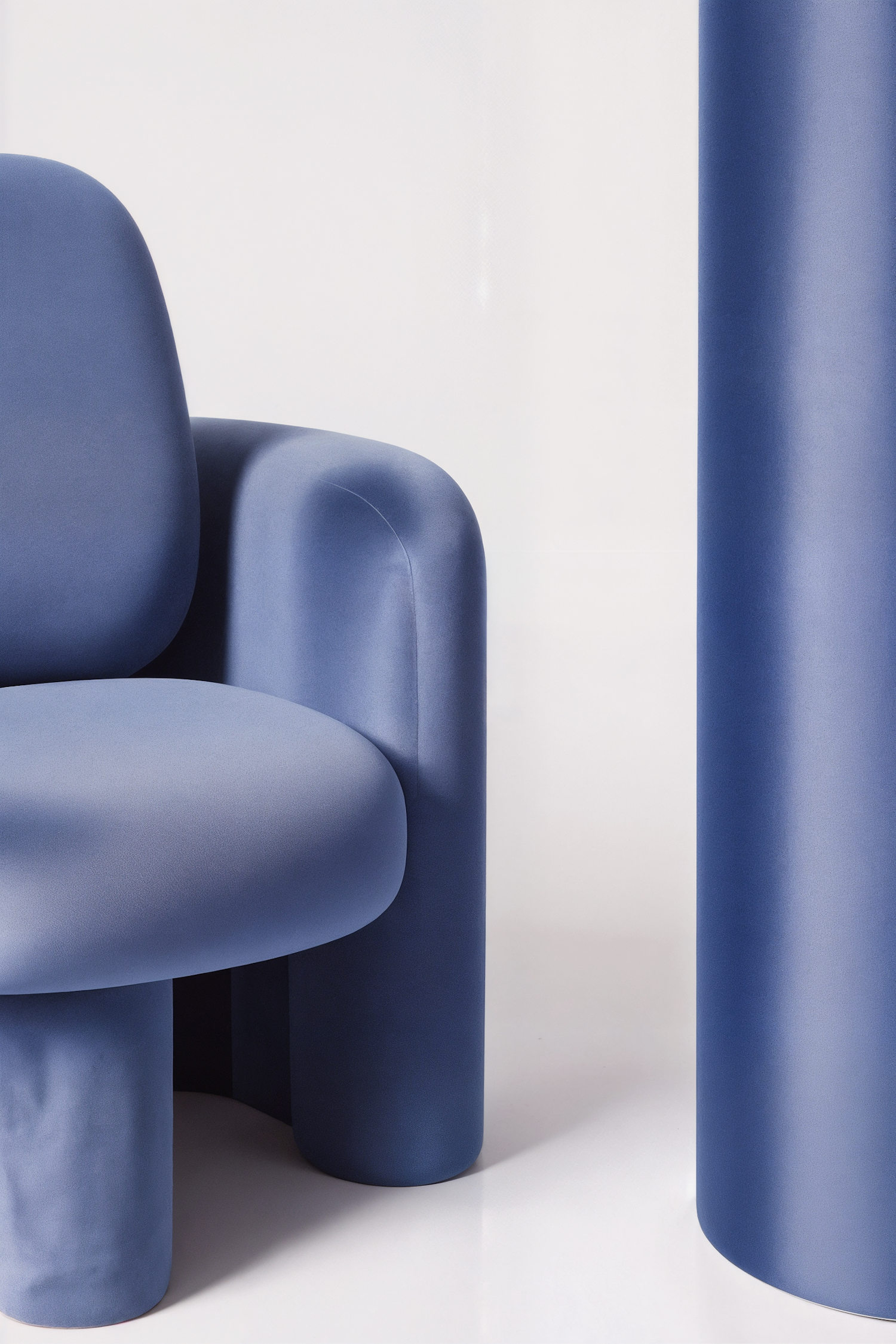 Modern blue chair with rounded edges and cylindrical legs, paired with a matching cylindrical object, set against a clean white background.