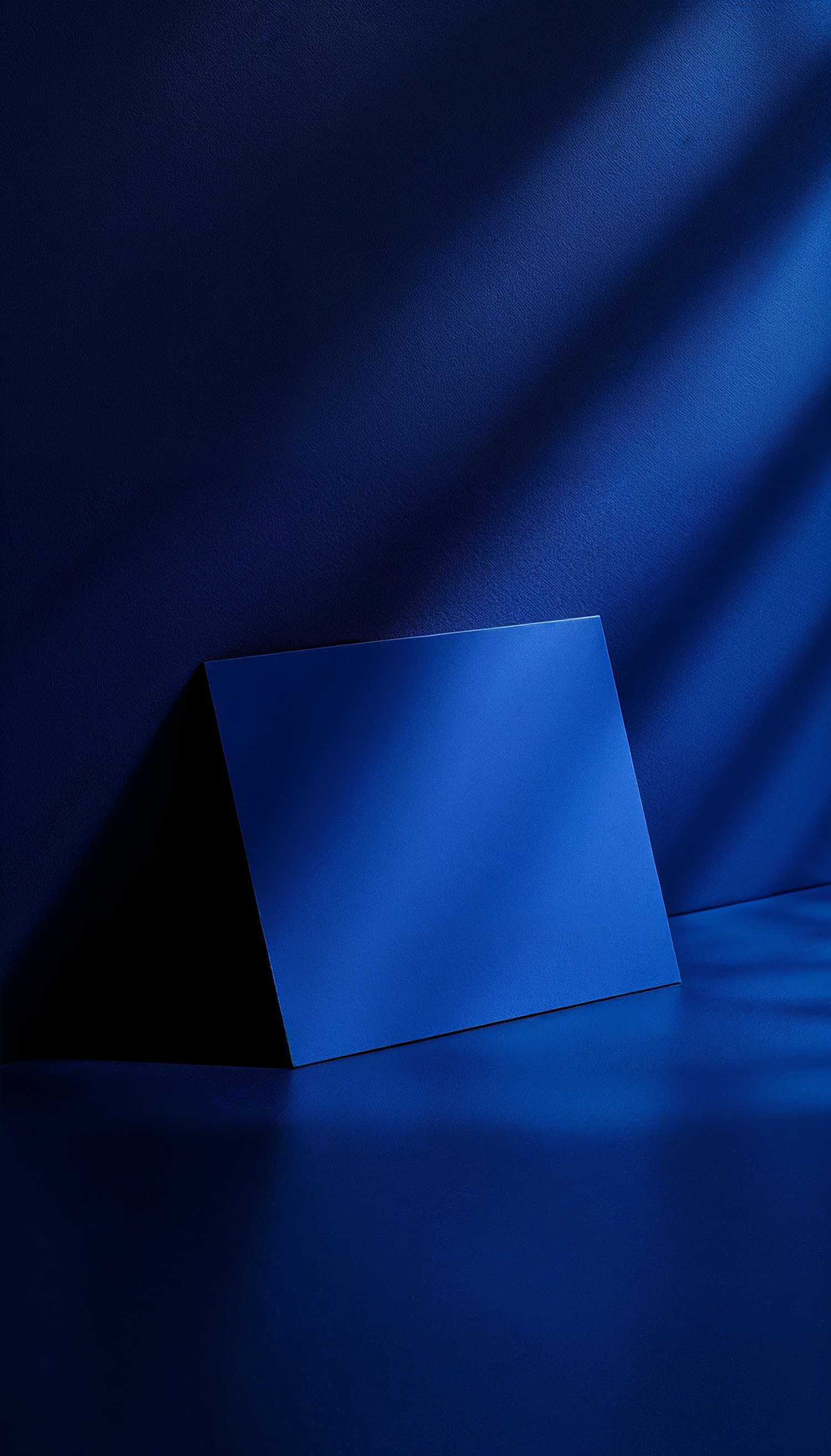 Minimalist blue scene with a rectangular panel casting shadows, creating depth and texture through lighting.