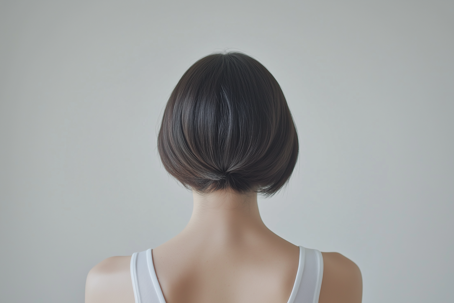 Minimalist back view of a person with a sleek bob haircut and a white sleeveless top against a plain light background.