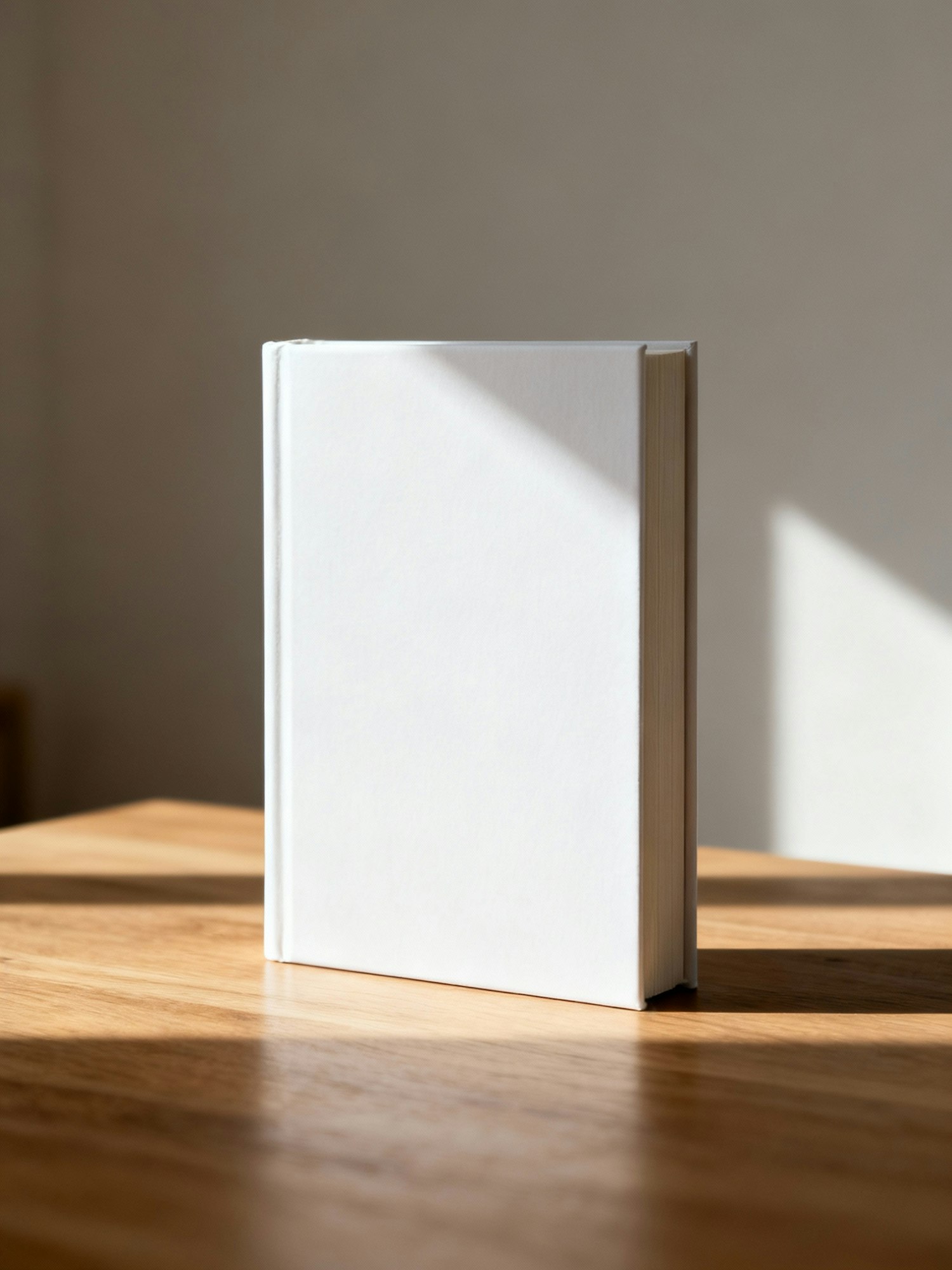 Minimalist mockup photography, soft natural daylight, clean and professional style, realistic textures, editorial look, warm neutral tones, shadows adding depth, no text, no design, white surfaces only. Blank hardcover book standing upright on a wooden table, soft daylight entering from the side, clean and professional look.