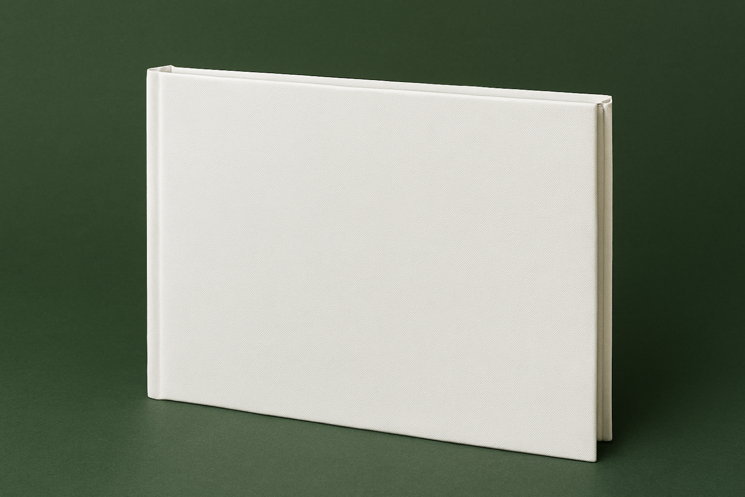 Minimalist white hardcover book with a textured finish, set against a dark green background for a clean and elegant look.