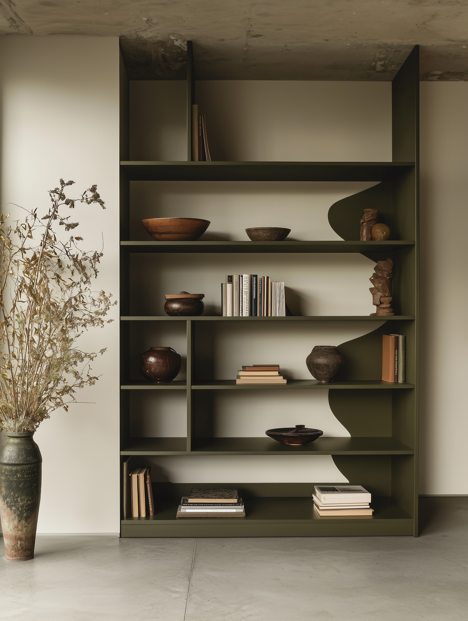Minimalist olive green bookshelf with ceramics, books, and dried flowers in a modern industrial space. Perfect for natural decor inspiration.