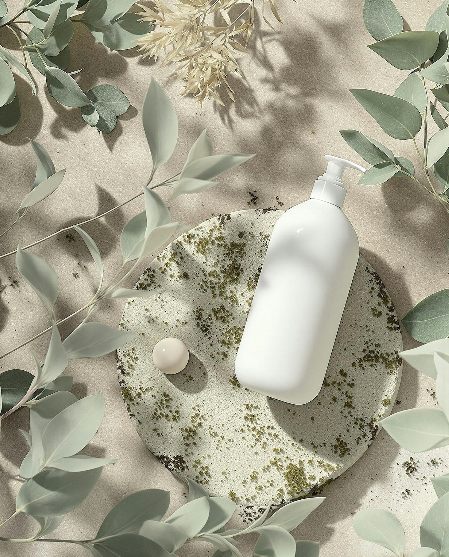 Aesthetic arrangement of a white bottle with botanical elements and textured details, evoking a sense of tranquility and natural beauty.