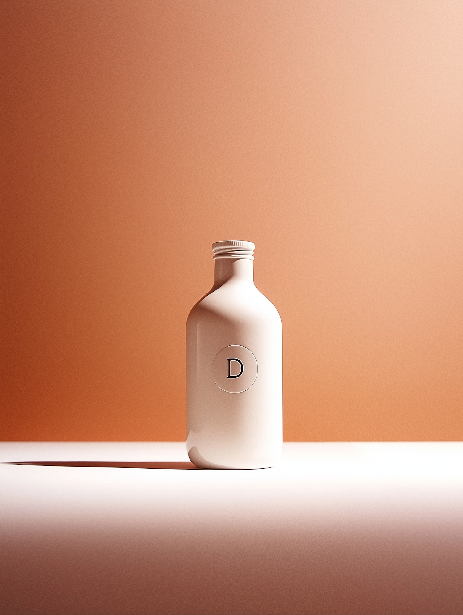 Minimalist cream bottle with 'D' label against a warm gradient background, showcasing sleek design and modern aesthetics.