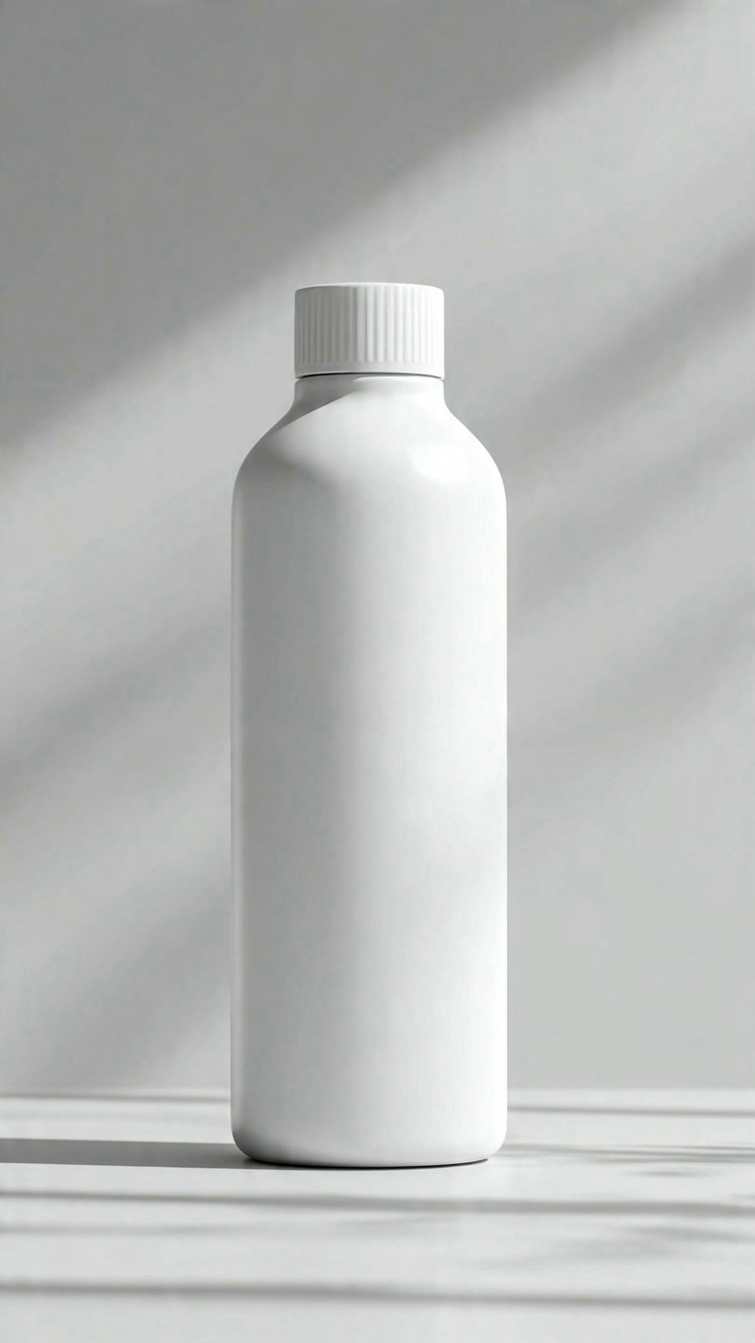 A clean, minimalistic image of a white plastic bottle with a screw-on cap, set against a neutral gray background with soft lighting.