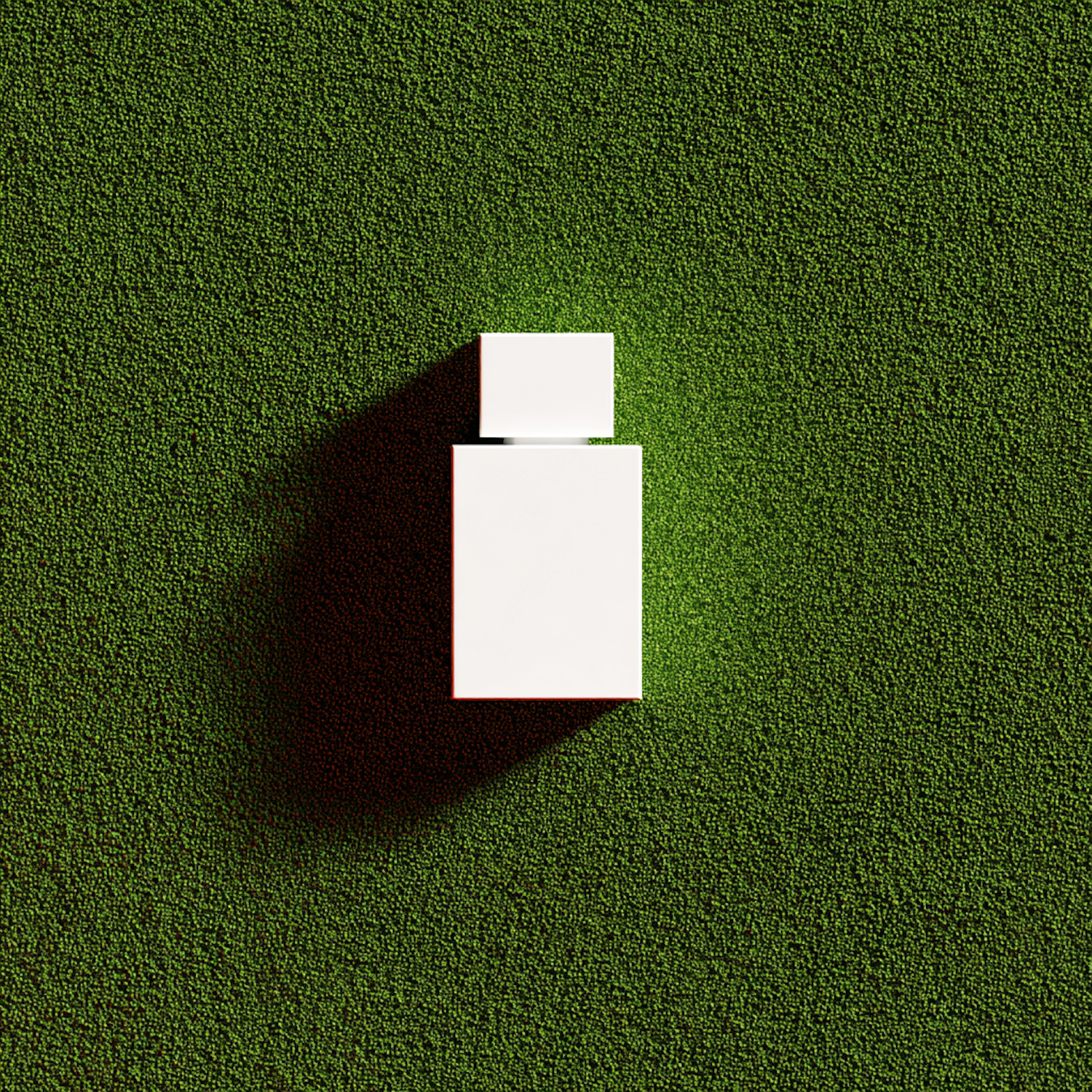 Minimalist white bottle on a textured green surface, casting a shadow. Perfect for modern product design or branding concepts.