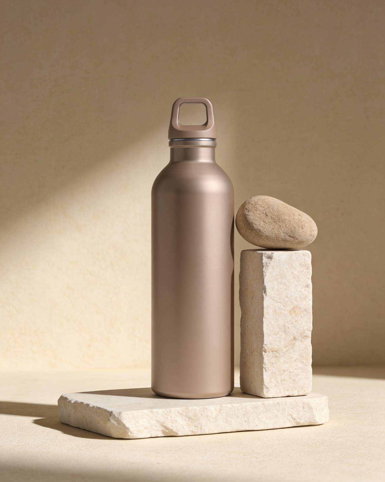 A stylish metallic water bottle displayed with natural stones on a neutral background, showcasing a minimalist and modern aesthetic.