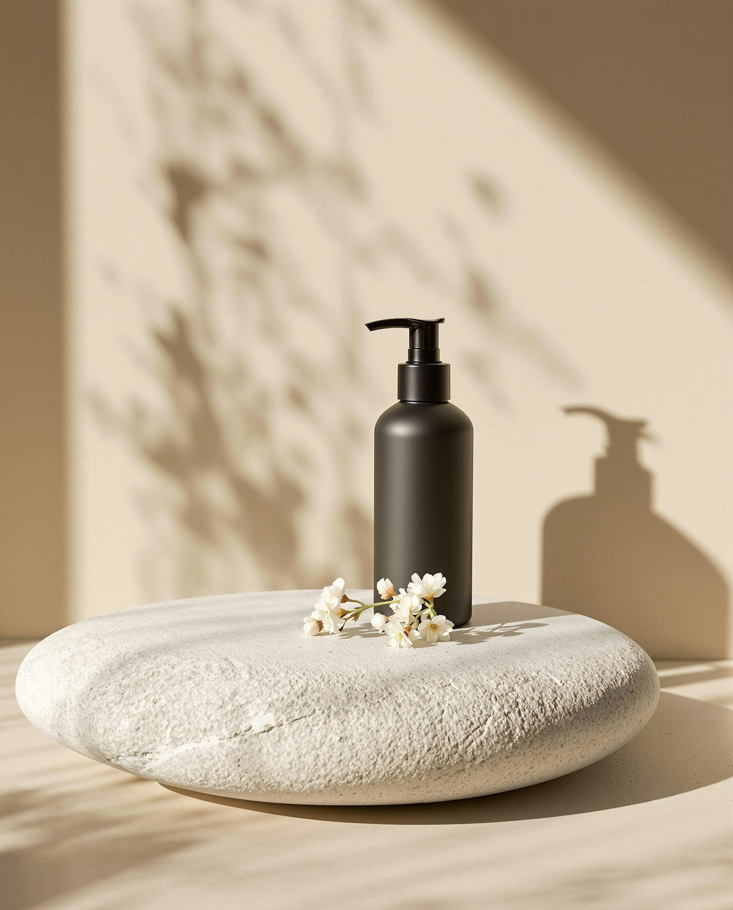 Minimalistic product display with a dark pump bottle, delicate white blossoms, and natural shadows, exuding elegance and simplicity.
