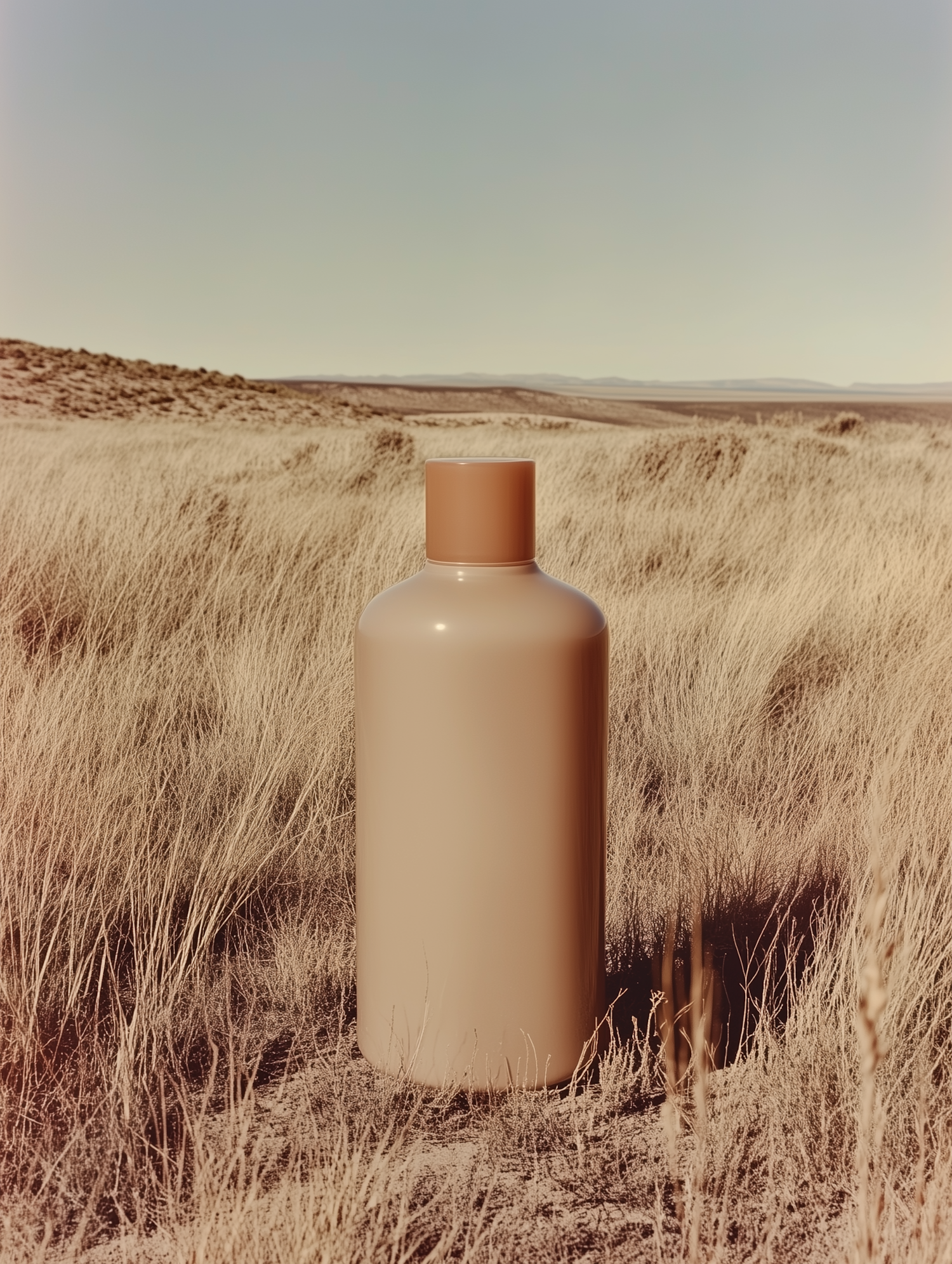 A sleek beige bottle in a dry grassy field under a clear sky, blending modern design with a natural, arid landscape.