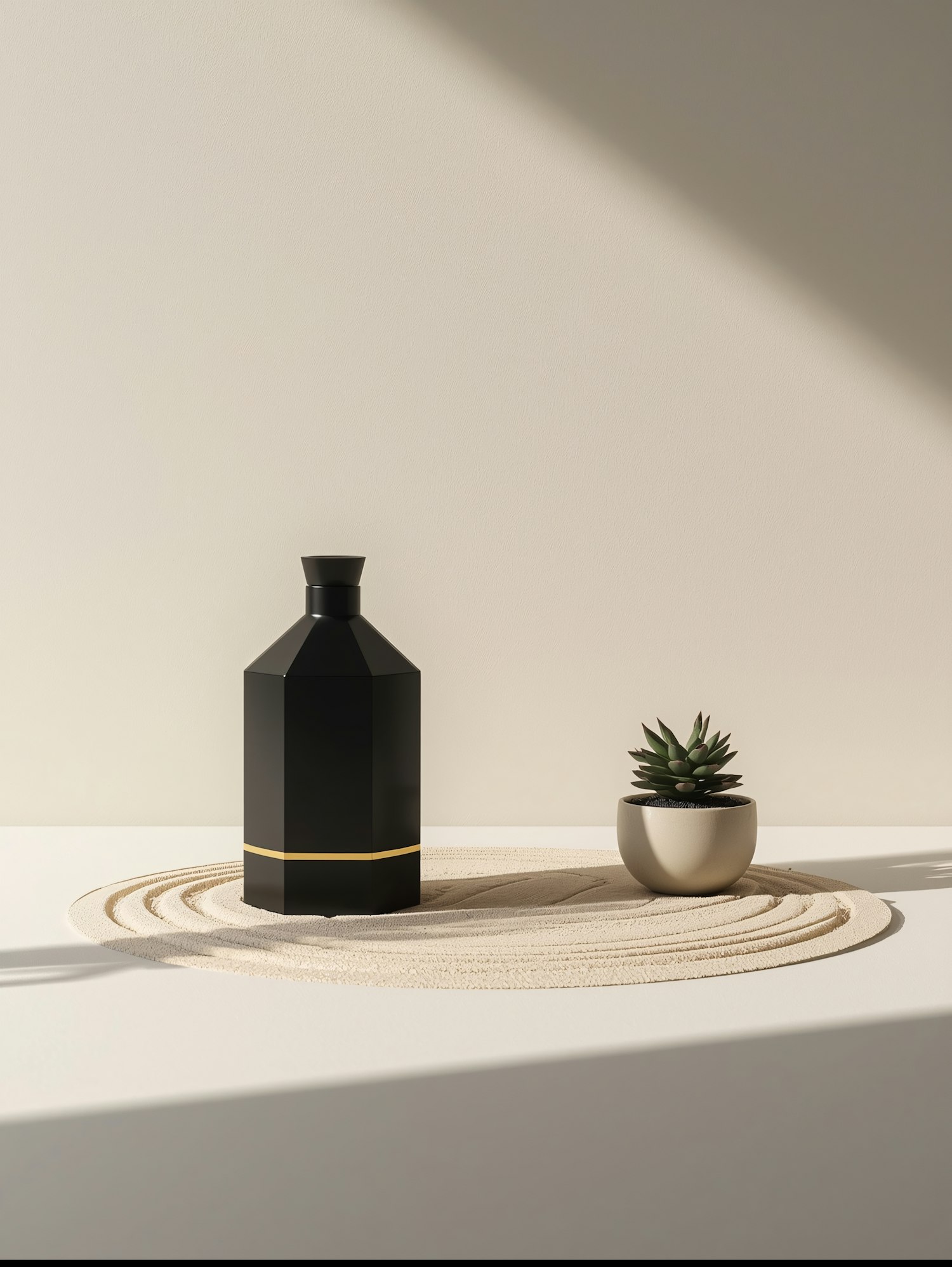 Minimalist decor with a black bottle, gold accent, and a potted succulent on a beige mat, bathed in soft natural light.
