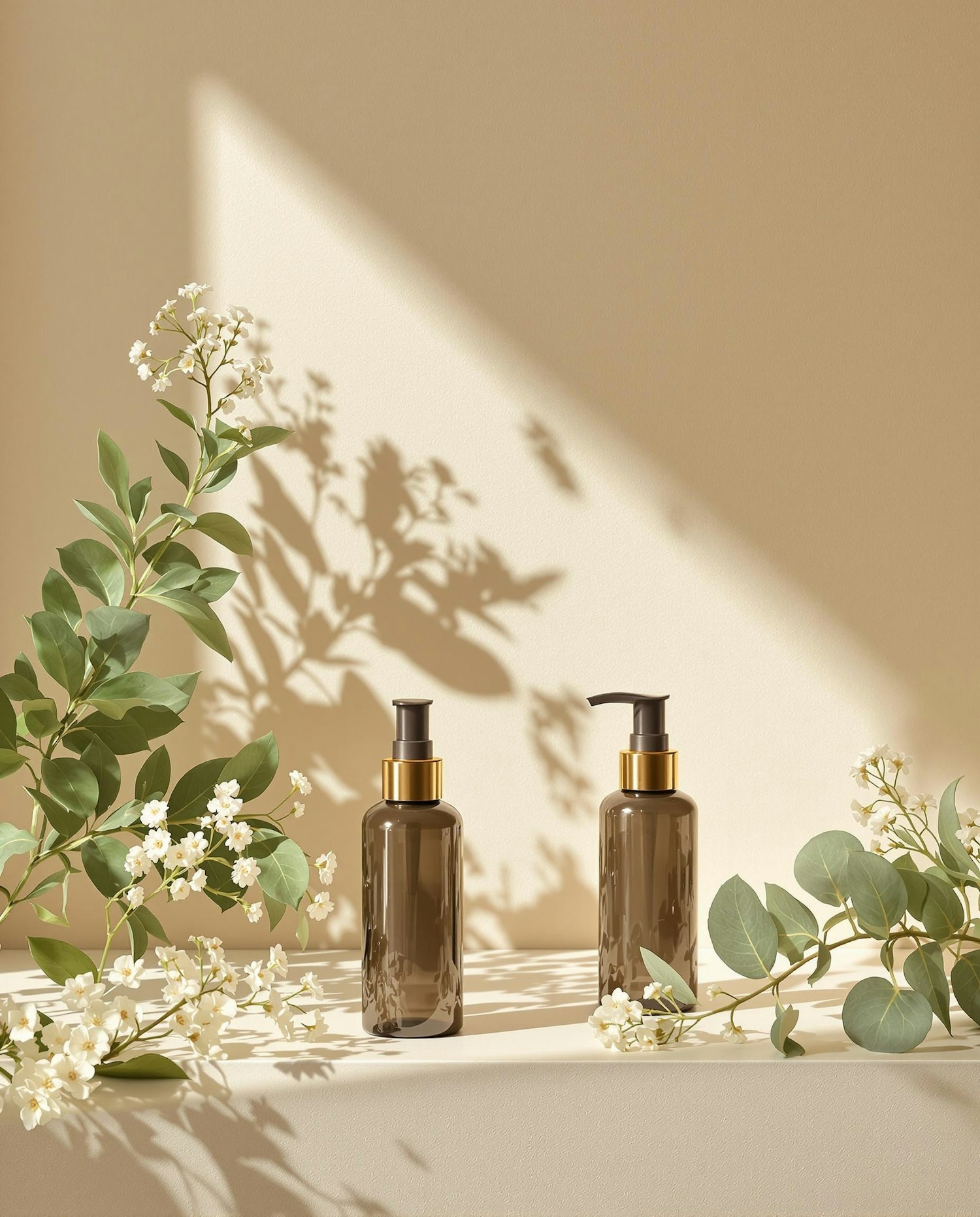 Amber pump bottles with golden caps surrounded by greenery and white flowers on a neutral beige background, casting soft shadows.
