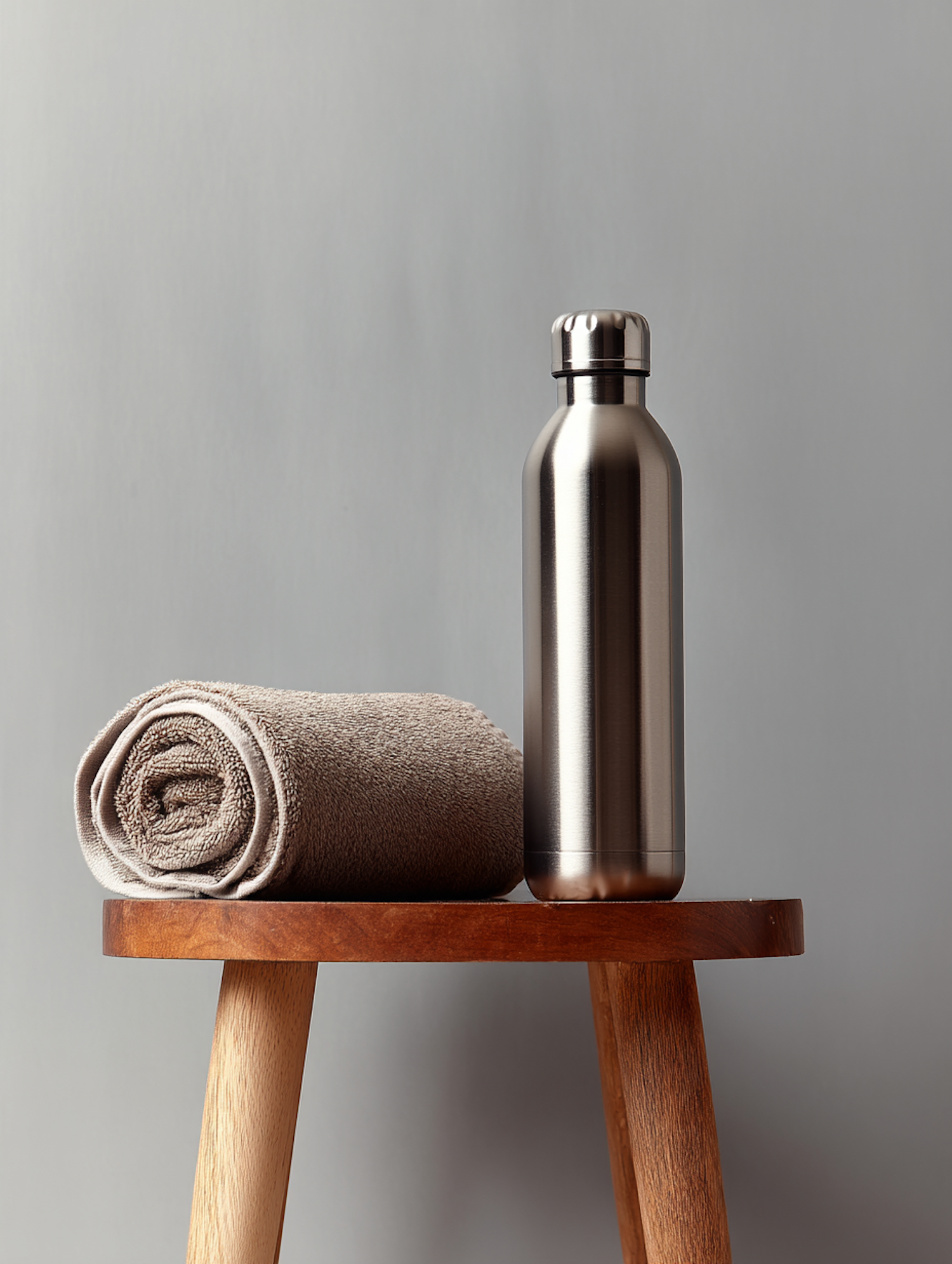 Minimalist setup with a stainless steel water bottle and rolled beige towel on a wooden stool against a gray background.