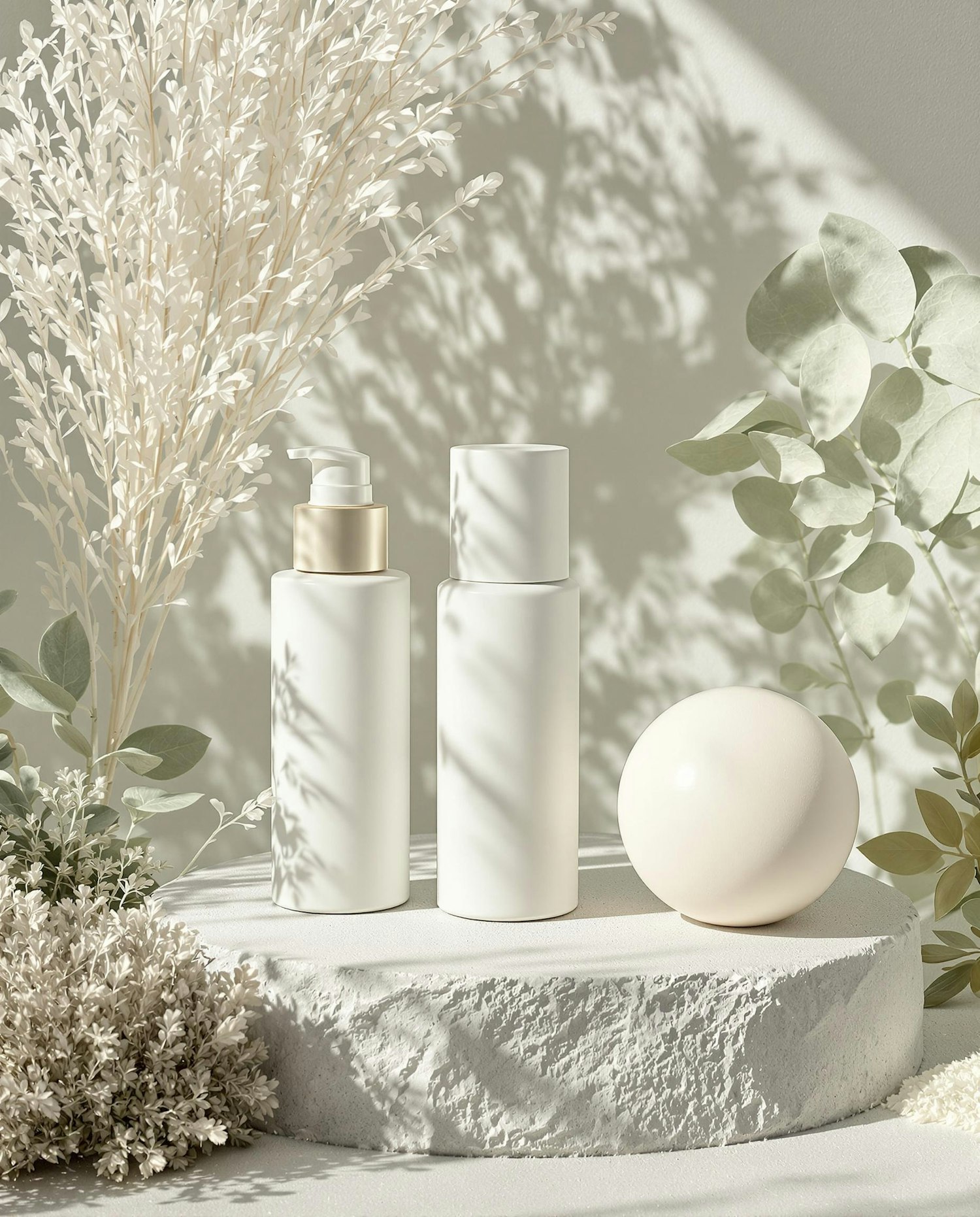 Minimalist scene with white bottles, a round object, and soft natural plants on a textured surface, reflecting serene aesthetics.