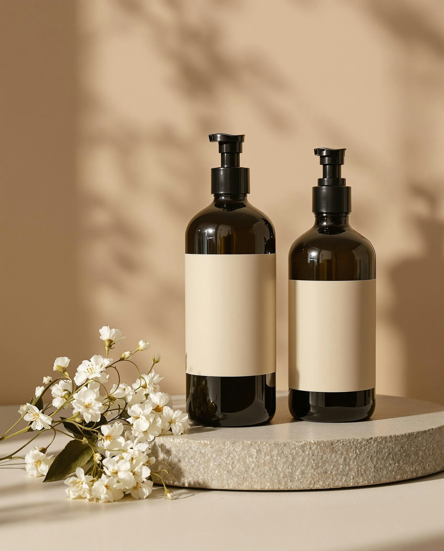 Elegant brown glass pump bottles with simple labels on a beige backdrop, complemented by white flowers on a decorative surface.
