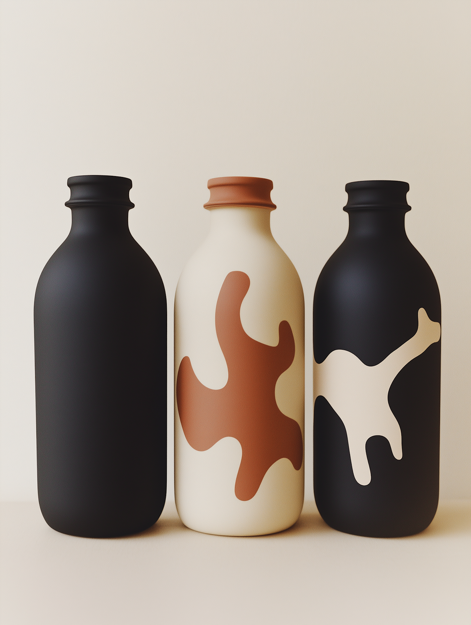 Three modern matte bottles with abstract designs in black, cream, and terracotta tones, arranged against a neutral background.