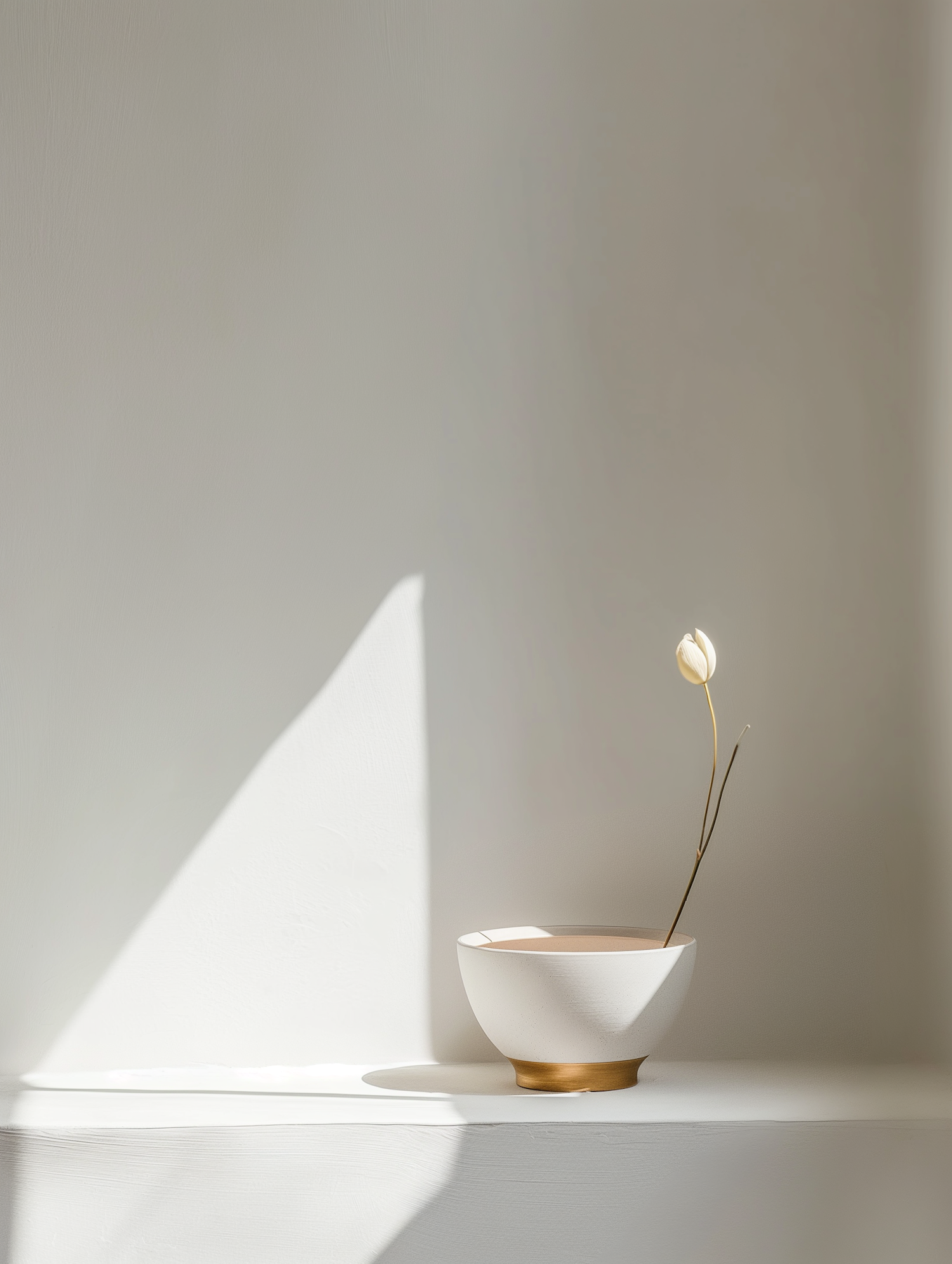 Minimalist white bowl with golden base and single flower, bathed in soft light, creating a serene and elegant atmosphere.